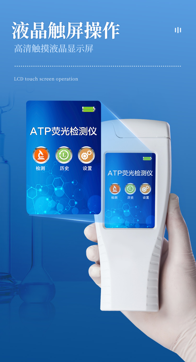 该设备为全新升级产品,大屏幕触摸显示屏,代替传统按键。操作采用生物化学反应方法检测ATP含量,ATP荧光检测仪基于萤火虫发光原理,利用“荧光素酶—荧光素体系”快速检测三磷酸腺苷(ATP)。ATP拭子含有可以裂解细胞膜的试剂,能将细胞内ATP释放出来,与试剂中含有的特异性酶发生反应,产生光,再用荧光照度计检测发光值,微生物的数量与发光值成正比,由于所有生物活细胞中含有恒量的ATP,所以ATP含量可以清晰地表明样品中微生物与其他生物残余的多少,用于判断卫生状况。