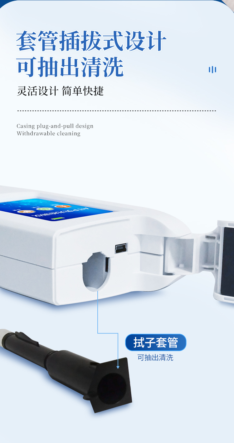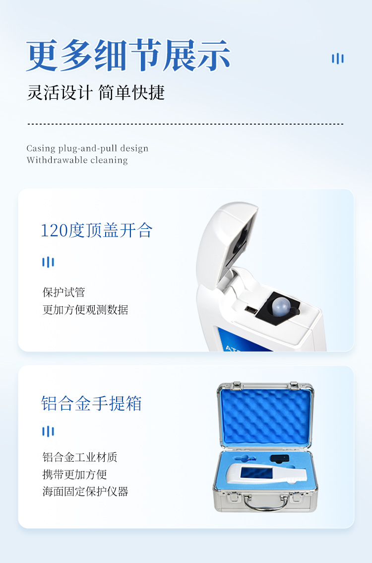 | 实用性 —— 可根据环境检测需求设定上下限值,做到数据快速评估预警,表面洁净度快速筛查。 | 灵敏度高 —— *************** | 速度快 —— 常规培养法18-24h以上,而ATP只需要十几秒钟 . | 可行性 —— 微生物数量与微生物体内所含ATP有明确的相关性。 通过检测ATP含量,可间接得出反应中微生物数量 | 可操作性 —— 传统培养方法需要在实验室由经过培训的技术人员进行操作;而ATP快速洁净度检测操作非常简便,只需简单的培训即可由一般工作人员进行现场操作。 | 体验更好 —— 试子套管采用插拔式灵活设计,可定期清洗长期使用,延长仪器寿命。 |