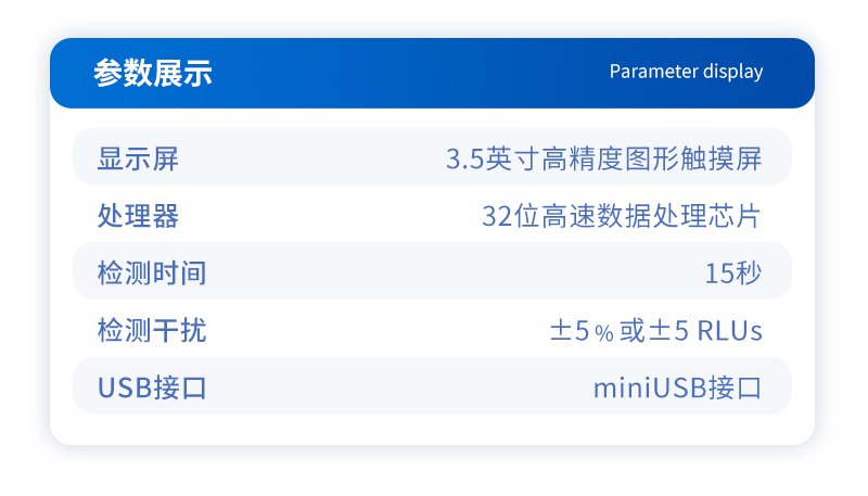 | 显示屏:3.5英寸高精度图形触摸屏 | 处理器:32位高速数据处理芯片 | 检测精度:********** | 大肠菌群:******** | 检测范围:**************** | 检测时间:15秒 | 检测干扰:±5﹪或±5 RLUs | 操作温度范围:5℃到40℃ | 操作湿度范围:20—85﹪ | ATP回收率:90-110% | 检出模式:RLU、大肠菌群筛查 | 50个用户ID 设定 | 可设定的结果限值个数:251个 | 自动判断合格与不合格 | 自动统计合格率 | 内置自校光源 | 开机30秒自检 | 配有miniUSB接口,可将结果上传至PC | 配备专用软件驱动U盘代替传统光盘 | 仪器尺寸(W×H×D):188 mm×77mm×37mm | 使用可充电锂电池免电池更换 | 备用状态(20℃):6个月 | 中文操作手册 | 稳定的液体荧光素酶 | 润湿的一体化采集拭子 |