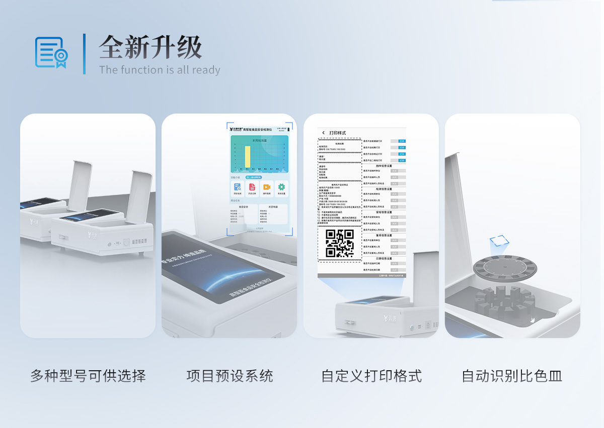 | 仪器采用台式一体化系统检测技术,将分光光度模块、新型农残检测模块、数字化管理模块、无线通讯模块高度集成于一体,支持检测200种食品安全检测项目,同时预留升级检测方法。 | 仪器检测模块标准化、智能化,可随意自由组合。检测箱体内置多个标准检测单元,检测模块可以调整配置。 | 仪器采用全新安卓智能系统,主控芯片采用 ARM Cortex-A7,RK3288/4核处理器,10.1寸高清液晶触摸竖屏,更加**的UI交互界面,运转快捷;仪器配备无线通信模块: 4G(APN)通讯模块、Wifi模块,蓝牙传输,同时具有双USB接口以及RJ45接口能以多种方式实现数据保存和数据传输功能。 | 创新检测模式: | ★检测通道:≥12通道;采用精密旋转比色池设计,使用同芯片同光源校准精度,解决不同光源之间的误差值。1-12通道间误差0.1%。(***:**202022821055.2) | ★仪器具有自动识别比色皿检测功能,即:将样品比色皿放入仪器后,点击样品检测,仪器自动识别比色皿进行通道检测。 | 进口高精光源: | 高精度进口四波长冷光源,通道配置 410、520、590、630nm 波长光源,一个光源芯片驱动一个光源,误差极小,每台设备单独**校准光源,**比对,同时参照四种不同波段光源全方位覆盖市面上99%的农残食品项目检测。 | 智能化操作系统: | 便捷操作系统:设备检测时可在同一检测界面自动对应相关检测通道一次性选择1-12个样品名称,无须退出界面,节省操作时间。 | 数据集成系统:设备首页自动统计检测数据包含:周检测数据、月检测数据,全部检测总数量,均包含检测总数,合格数,不合格数,以及相关柱形分析图,对各项检测数据清晰掌握,无需电脑查询,更加快捷直观。 | 项目预设系统:支持添加单个及多个相同或不相同的任务预设,一键快速调取,每一个任务分别可以设置不同的样品、批次、编号、来源、备注、抽样信息、检测信息、受检信息、复核信息等更多信息。无缝链接平台和APP实时查看下发任务。 | 数据监管系统:同步对接监管平台,数据可局域网和互联网数据上传,检测结果可选择直接传至食品安全监管平台。集成OSS输出存储服务、区分设备定向管理应用,进行区域食品安全监管及大数据分析处理与数据统计,检测区域食品安全长短期动态,达到食品安全问题预估、预警。 | 自定义打印系统:内置全新打印系统,新创自定义打印方式,可按需灵活设置开启或关闭:产品合格证(国家农业部标准要求),二维码,抽样信息、检测信息,受检信息、复核信息、抽样日期、检测日期等信息的打印。 | 系统远程更新功能:可定向分客户分仪器更新系统,按照不同客户后期实际需求添加项目,无需机器返厂,即可远程实时升级全新系统,节省时间成本及避免运输造成设备损坏。 | 仪器主机采用一体化防水、抗压、防撞击、防腐蚀箱体设计,同时配备交直流供电,可连接车载电源,可选配大容量充电锂电池,满足现场野外检测需求。 | 安全证书,放心保障:仪器具有中国计量科学研究院校准证书,权威认证。 |