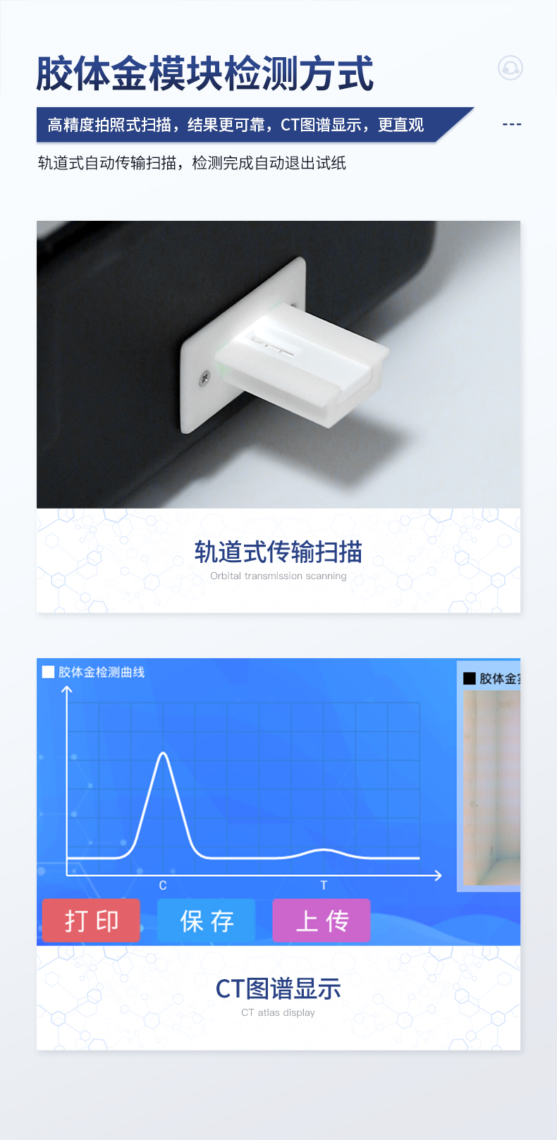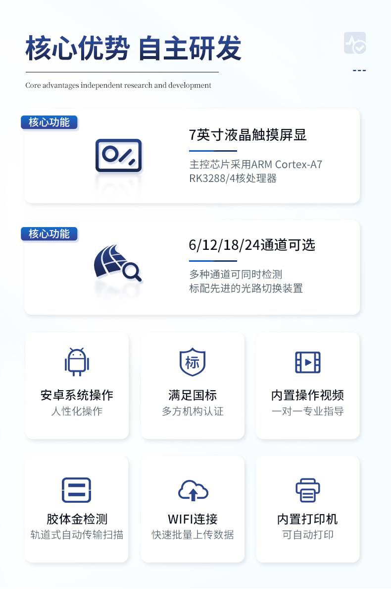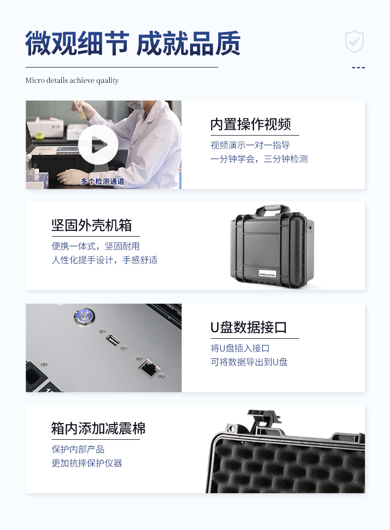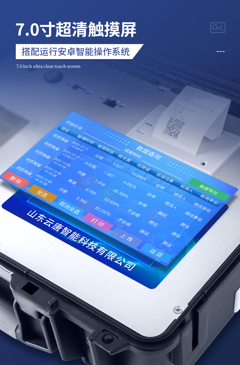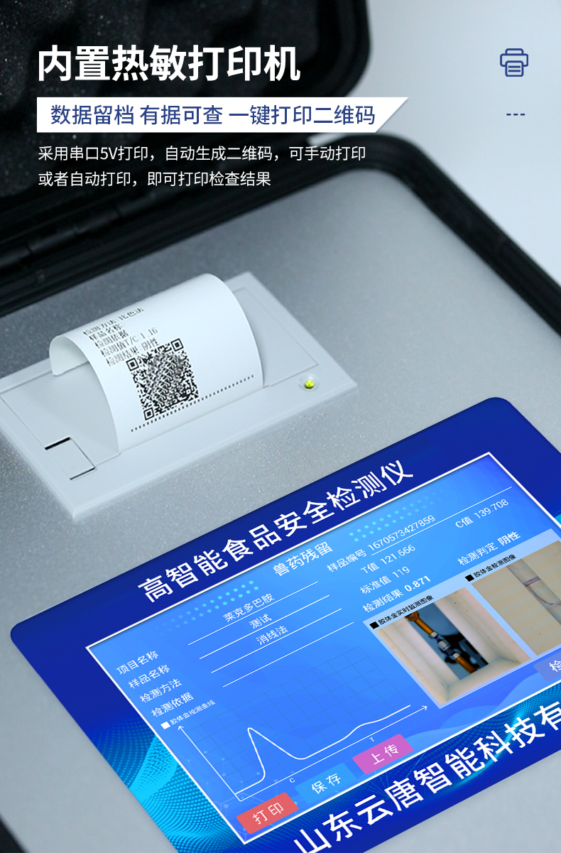 | 安卓智能操作系统,采用更加**的UI交互界面,仪器具有wifi联网上传、4G联网传输、GPRS无线远传、网线连接功能,快速批量上传数据。 | 智能化程度高,仪器具有自检功能:具有开机自检和调零功能,具有自动检测重复性功能。 | 新一代高速热敏打印机,检测完成可自动打印或批量打印检测报告和二维码。 | 仪器带有监管平台,数据可局域网和互联网数据上传,检测结果直接传至食品安全监管平台。进行区域食品安全监管及大数据分析处理与数据统计,检测区域食品安全长短期动态,达到食品安全问题预估、预警 | 一体化主机,包含食品安全检测模块、多通道农药残留检测模块、胶体金免疫层析检测模块。 | 一体化便携式快检设备,满足现场及流动检测使用需求,能够在同一软件下实现所有检测项目的检测,并可通过同一窗口直观显示检测结果。 | 胶体金模块检测方式:轨道式自动传输扫描,检测完成后自动退出检测卡。 | 食品安全检测仪CT线自动识别,无需手动调整,检测完成自动显示CT坐标曲线。 | 内置强大的数据库,具有多品类多种类样品菜单功能,可灵活选择检测样品,不同的检测通道可同时检测不同的样品项目。也可在仪器上直接编辑录入样品名称、检测指标、送检单位等信息并保存进样品数据库。 | 产品内置操作演示视频,是您身边的化验指导专家。 | 样品处理简单省力,整体操作快速、安全、便捷。 | 仪器具有自身保护功能,可设置用户名及密码,防止非工作人员操作等。 | 高灵敏度,高检测精度,高重复性精度,扫描式高精度光学传感器。 | 结果判定线可修改,对照值标定值可保存,断电不丢失数据。 | 兼容市场上所有的胶体金卡,使用耗材不受限制,极大增强用户使用体验。 | 仪器具有重新校准、锁定、恢复出厂设置功能。 |