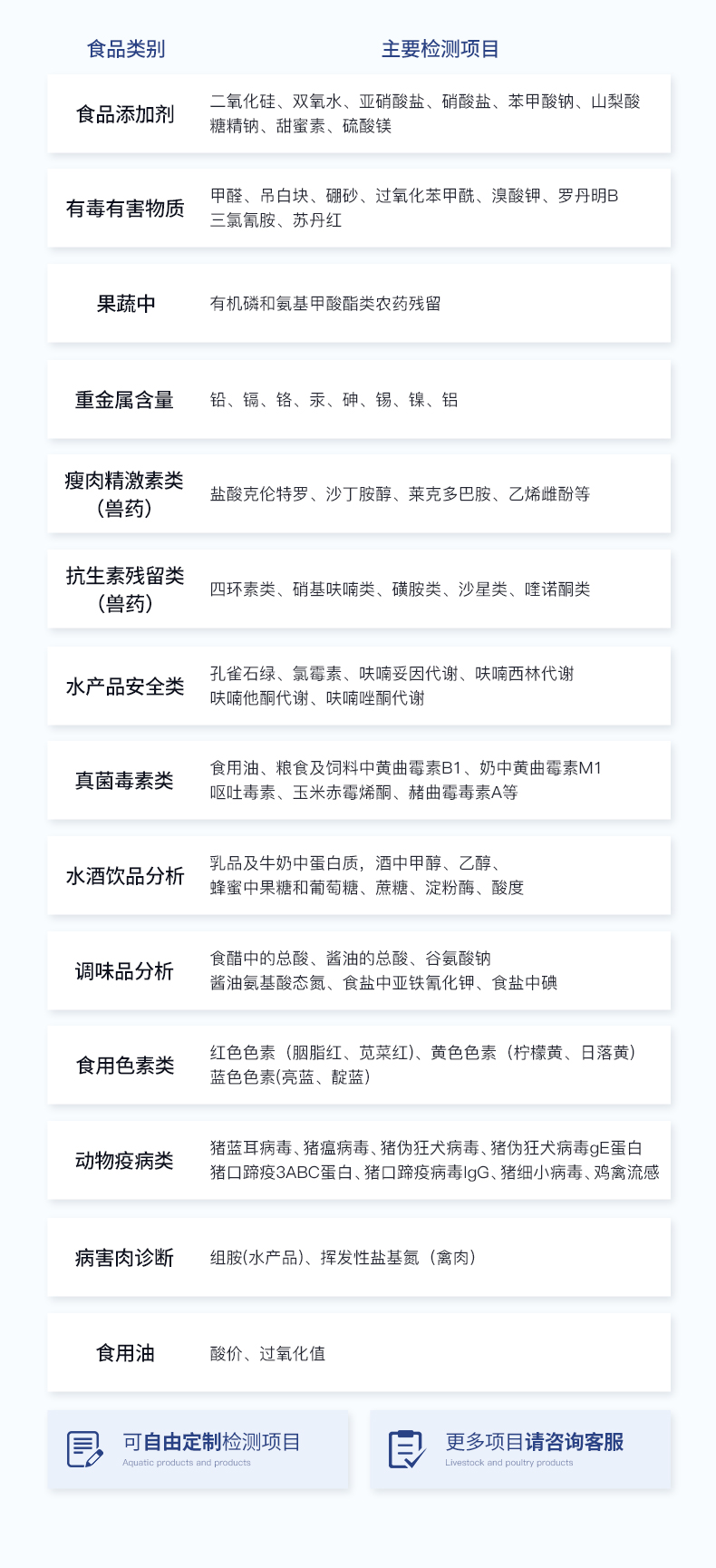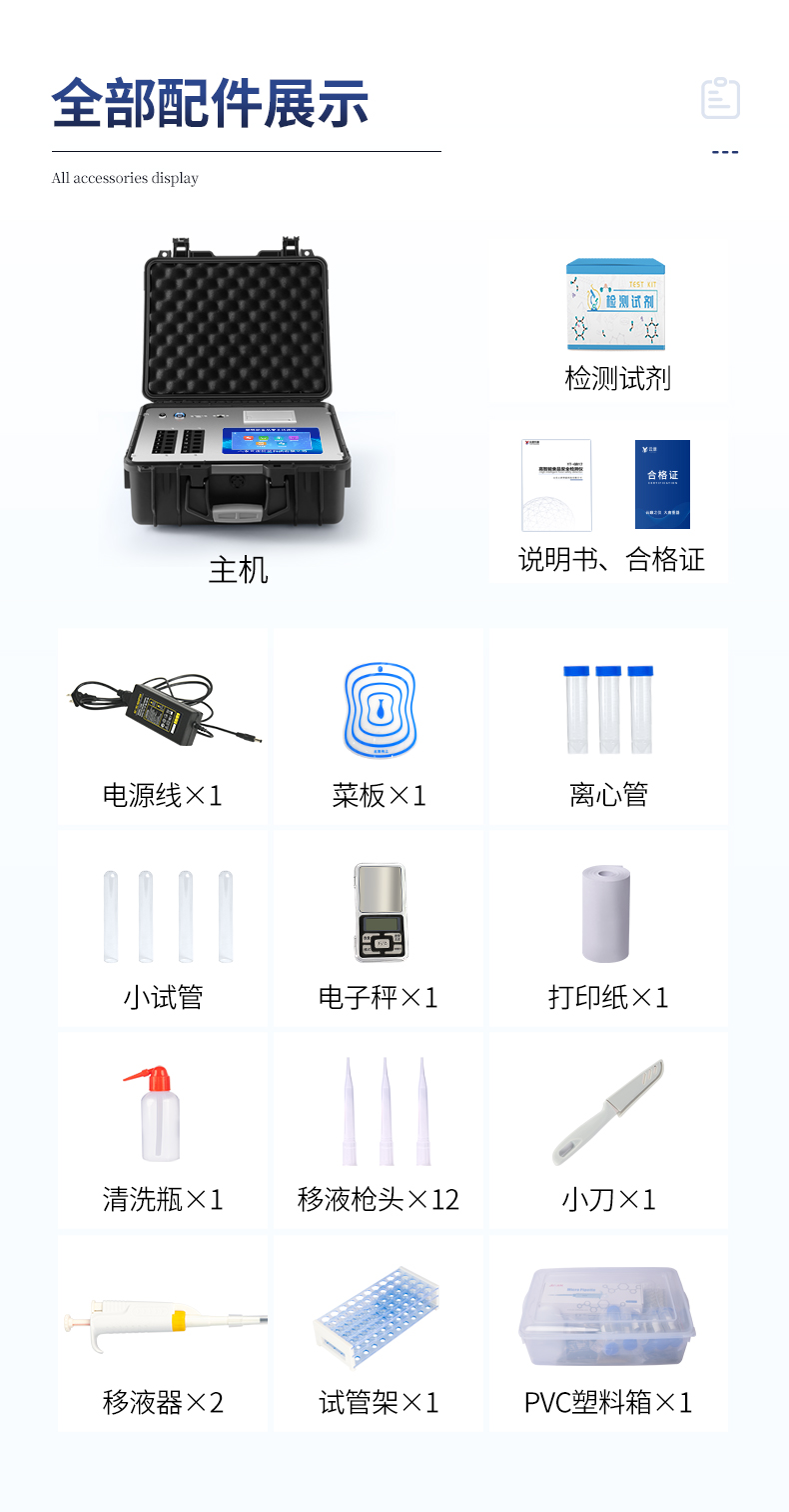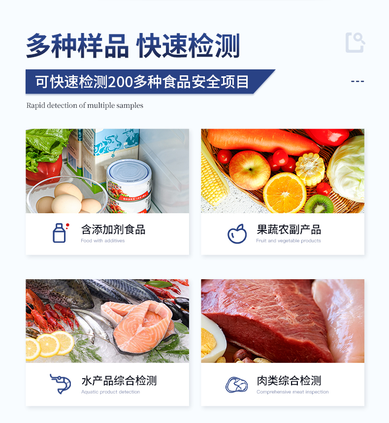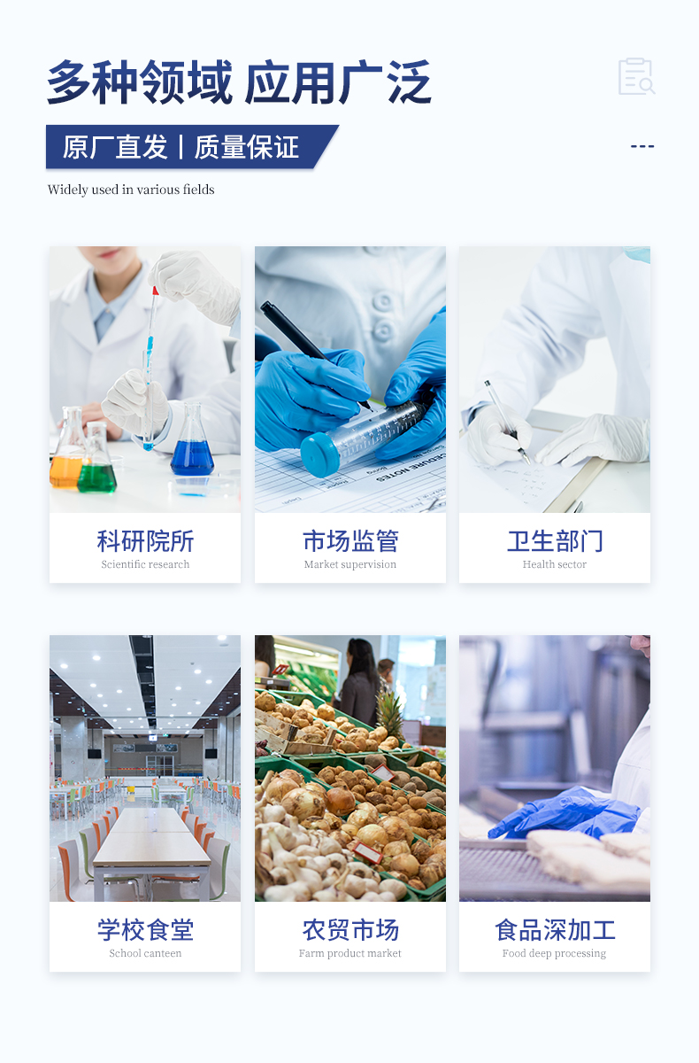 | 食品添加剂:二氧化硫、双氧水、亚硝酸盐、硝酸盐、苯甲酸钠、山梨酸、糖精钠、甜蜜素、安赛蜜、硫酸镁等 | 有毒有害物质:甲醛、吊白块、硼砂、过氧化苯甲酰、溴酸钾、罗丹明B、三聚氰胺、苏丹红等 | 农药残留:酶抑制率法:有机磷氨基甲酸酯类农药;胶体金法:各种具体农药检测 | 病害肉诊断:组胺、挥发性盐基氮、肉制品酸价、水发产品中组胺 | 重金属含量:铅、镉、铬、汞、砷、锡、镍、铝等;食用油脂检测:过氧化值、酸价、油脂丙二醛等。 | 食用油脂检测:::过氧化值、酸价、油脂丙二醛、总多酚等。 | 瘦肉精激素类(兽药):盐酸克伦特罗、沙丁胺醇、莱克多巴胺、己烯雌酚、喹乙醇等 | 抗生素残留类(兽药):四环素类、硝基呋喃类、磺胺类、β-兴奋剂类、沙星类、磺胺类、喹诺酮类,甲砜霉素,氟苯尼考,金刚烷胺、替米考星、庆大霉素、林可霉素、链霉素、恩诺沙星、环丙沙星、头孢啦啶、青霉素、阿莫西林等 | 真菌毒素类:食用油、粮食及饲料中黄曲霉毒素B1、奶中黄曲霉毒素M1、呕吐毒素、玉米赤霉烯酮、赭曲霉毒素A等 | 水酒饮品分析:乳品及牛奶中蛋白质;酒中甲醇、乙醇、杂醇油;蜂蜜中果糖和葡萄糖、蔗糖、淀粉酶、酸度;水中氰化物、余氯,饮料中维C等 | 调味品成分:食醋的总酸、酱油的总酸、芝麻油纯度、谷氨酸钠、酱油氨基酸态氮、食盐中亚铁氰化钾、食盐中碘等 | 食用色素类:红色色素(胭脂红、苋菜红、赤藓红、诱惑红)、黄色色素(柠檬黄、日落黄)、蓝色色素(亮蓝)等 | 动物疫病类:猪蓝耳病毒、猪瘟病毒、猪伪狂犬病毒、猪伪狂犬病毒gE蛋白、猪口蹄疫3ABC蛋白、猪口蹄疫病毒IgG、猪细小病毒、鸡禽流感等 | 水产品安全类:孔雀石绿、氯霉素、呋喃妥因代谢、呋喃西林代谢、呋喃它酮代谢、呋喃唑酮代谢、氟苯尼考、土霉素、金霉素、甲砜霉素、地西泮等 |