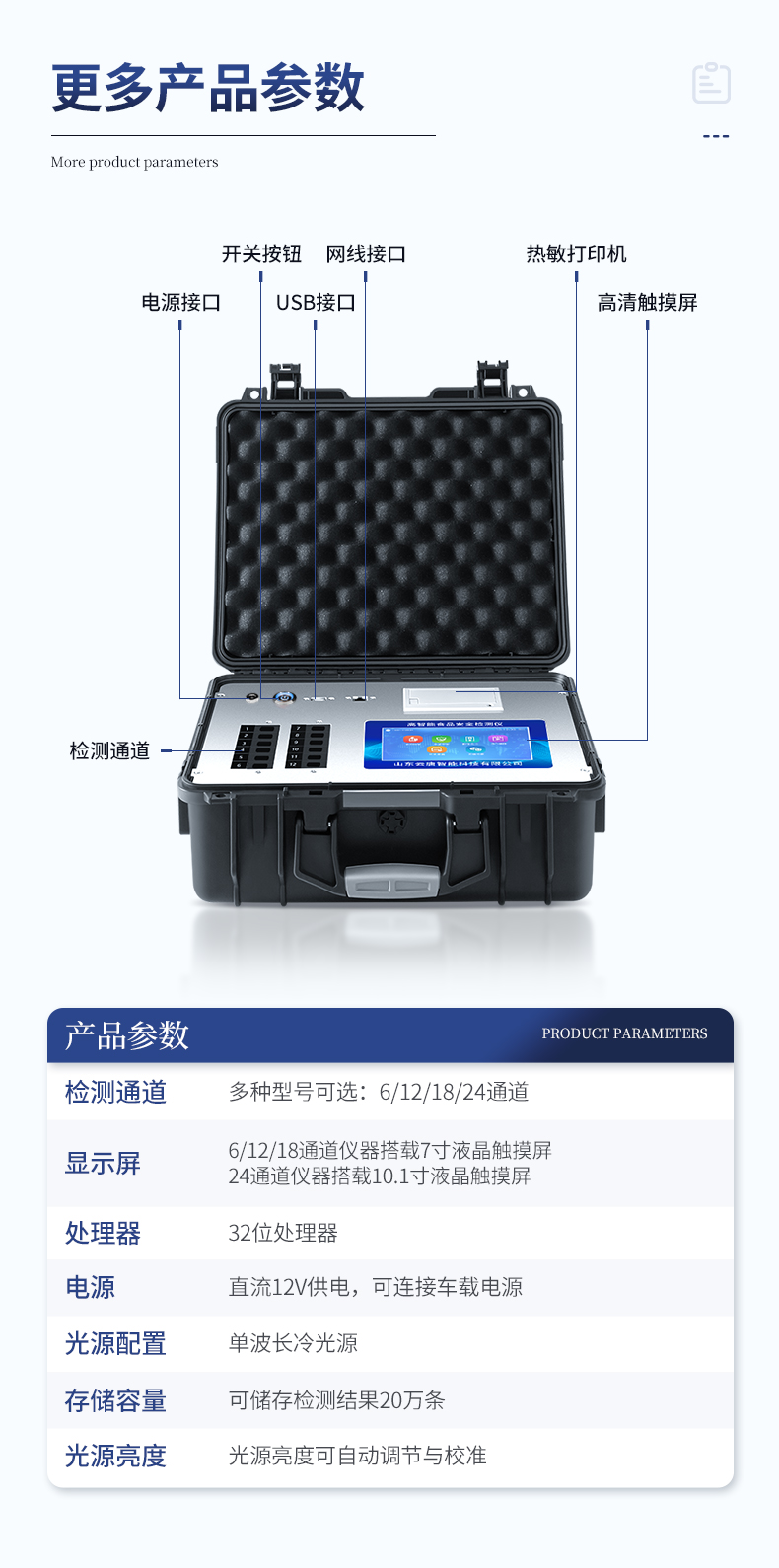 | 1、主控芯片采用ARM Cortex-A7,RK3288/4核处理器,主频1.88Ghz,运转速度更快速,稳定性更强。 | 2、显示方式:7英寸液晶触摸屏显示,人性化中文操作界面,读数直观、简单。 | 3、交直流两用,直流12V供电,可连接车载电源,可配6ah大容量充电锂电池,方便户外流动测试。 | 4、四波长冷光源,12个检测通道,每个通道均配置410、520、590、630nm波长光源,标配**的光路切换装置,专业光路切换功能可实现*多64波长,并且所有检测项目可实现所有通道同时检测。 | 5、智能恒流稳压,光强自动调节与校准,长时间连续工作光源无温漂现象。 | ★6、内置新国家限量标准,与所测结果进行现场比对,并持续更新标准。 | 7、不间断进样,连续检测 | 8、样本编号自动累加。 | 9、数据无线上传平台,并可从平台导出为Excel表格。 | 10、检测结果存储容量20万条。 | ★11、同时支持U盘拷贝,标准USB接口,免驱动插拔。 | 12、检测项目可扩充,固件可升级 | 13、仪器尺寸:430*343*188mm, 主机净重:5.1kg | 14、仪器包装尺寸:510*390*375mm 包装重量:8.5kg |