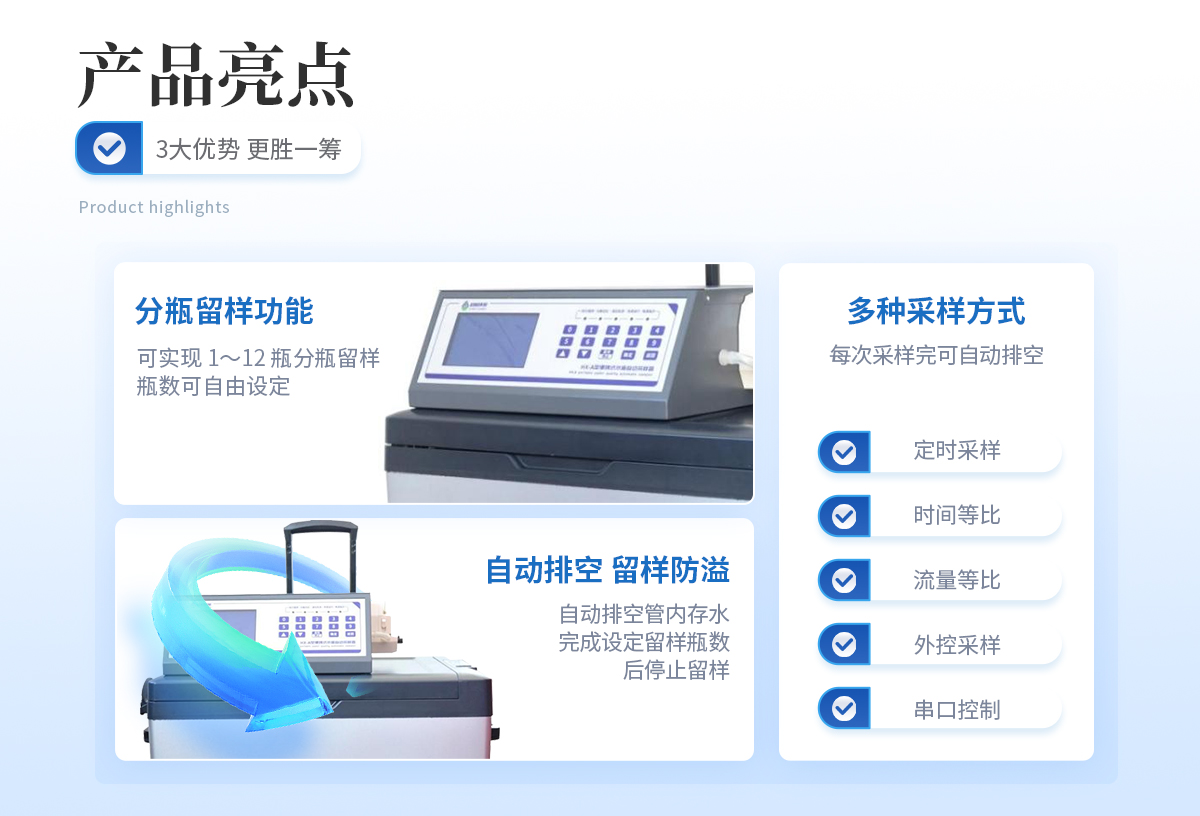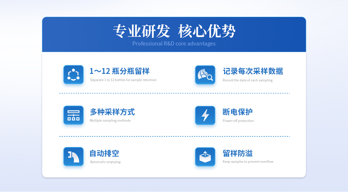 | 节能:**功率190W, 平均功率45W。 用环保的方式完成环保事业。 | 可靠:维护周期≥168h,蠕动泵管等耗品平均使用寿命三年; | 与水接触的所有容器均为模具加工的耐腐蚀材料; | 与水接触或可能会意外接触水的用电设备均为直流24V供电,更好的保护使用者; | 水样冷藏箱物理锁与密码电子锁并用,双人双锁确保水样安全; | 多种固定剂添加保障不同因子留存时间更长; | 合理的混匀桶结构,高速搅拌让水样混匀更完全,搅拌桨外四氟内304钢的结构确保不与水 样发生化学反应; | 智能:断电保护功能使采样器在因不可抗力导致采样器运行中断电,再次上电时,采样器所设定的参数不会改变,且能够恢复到断电前的工作模式继续运行; | 简单:安装简单,一人一小时既能完成一台采样器的现场安装; |