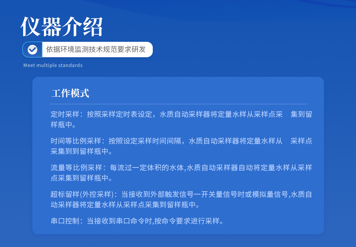 YT-SZC水质自动采样是一款具有水样采集、分析供样、水样保存、动态管控等功能的连续自动采样器。满足HJ 372-2007《水质自动采样器技术要求及检测方法》,适用HJ 353、354、355系列标准,符合HJ 212-2017《污染源在线自动监测系统数据传输标准》相关要求,参照HJ 493-2009《水质采样样品的保存和管理技术规定》,能够满足且高于污染源在线监测的采样需求,同时适用于智慧水务、缉毒采样、病毒采样、地表水采样等。