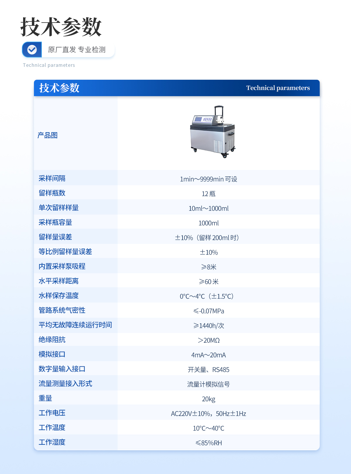 | 采样量误差:±5% | 等比例采样量误差:±10% | 留样量误差:±5 % | 等比例留样量误差:±10 % | 留样量重复性:≤3% | 系统时钟计时误差:≤10 s/24 h | 冷藏箱温度控制误差:±2 ℃ | 模拟量采集误差:±0.05 mA | 保存剂注入量误差:±10 % | 采样垂直高度:≥5 m | 水平采样距离:≥50 m | 管路系统气密性:≤-0.08 MPa | *小维护周期:≥168 h |