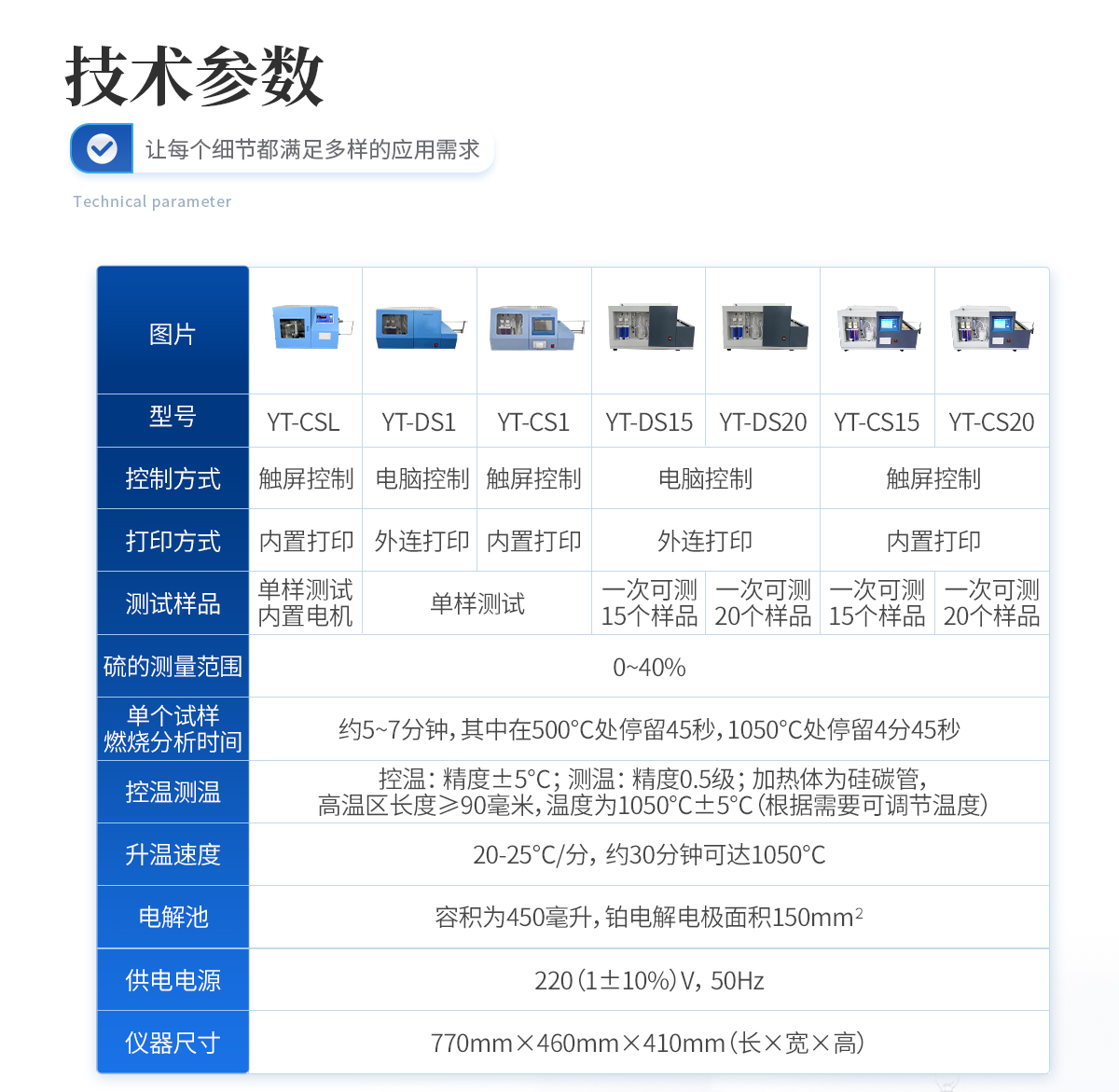 | 1.硫的测量范围:0—40%. | 2.单个试样燃烧分析时间:约5--7分钟,其中在500℃处停留45秒,1050℃处停留4分45秒。 | 3.控温:精度±5℃。测温:精度0.5级;加热体为硅碳管,高温区长度≥90毫米,温度为1050℃±5℃(根据需要可调节温度) | 4、 密度:如下表规定: St,% 重复性St,ad,% 再现型St,d,%<1 1="" 0.05="" 0.10="">4 0.20 0.30 | 5.升温速度:20--25℃/分,约30分钟可达1050℃。 | 6.电解池:容积为450毫升,铂电解电极面积150mm2 。 | 7.供电电源:220(1±10%)V,50Hz. | 8.仪器尺寸(mm) 长×宽×高(770×460×410) |