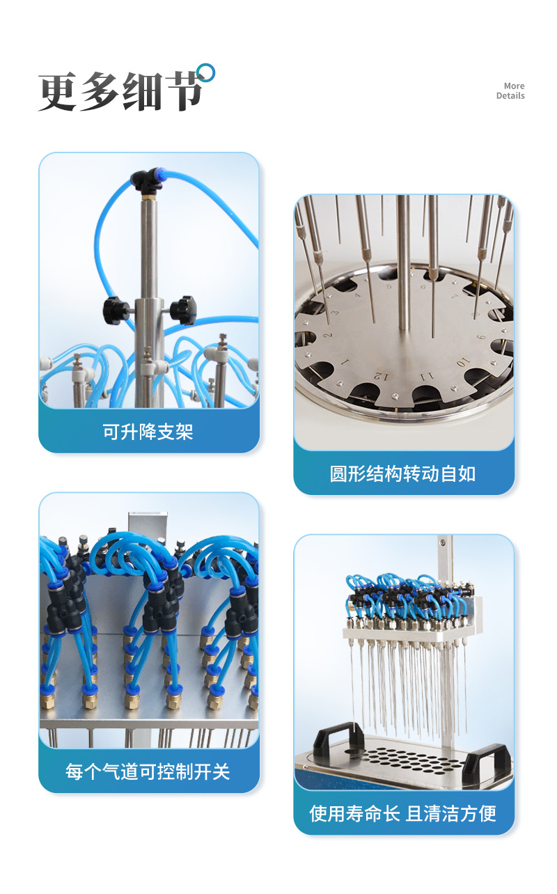 | 每个吹针都可以独立控制,避免引起交叉污染。 | 仪器气腔高度可以自行调节,配备标准气针长度为15厘米。 | 氮吹仪有36个气道控制开关,节约气体,每根吹气针的位置可独立改变吹扫位置,使之适用不同的样品容器及不同的样品位置 | 在浓缩有毒溶剂时,整个系统可置于通风柜中,降低危险。 | 内置超温保护装置,自动故障检测及报警功能,方便实用。 | 仪器有LED显示屏,温度同步显示、时间递减显示,可时时观察温度变化。 | 具有整体温度更均匀,加热速度快 | 本产品还可以作为普通的干式恒温器使用 | 使用起来更简便,而且温度也可以达到150℃,可以更好浓缩样品 |