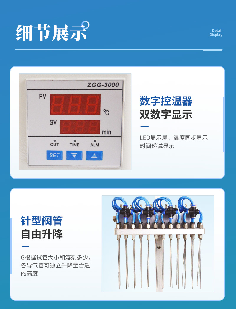 | 分配室上各气针通道可组合使用或单独使用,每一路气针均可单独开关。分配室的高度可视需要调节。 | 每一路气体流量可单独进行调节,克服了不可调氮吹仪各气路气流量大小不一的弱点。 | 数字温控器,双数字显示. | 可能与溶剂接触的部件均采用不锈钢材料、合金铝并表面进行塑料喷涂,使用寿命长且清洁方便。 | 整机可放入通风橱中使用。 | 一般标配的加热块规格为孔径∮16mm。 |