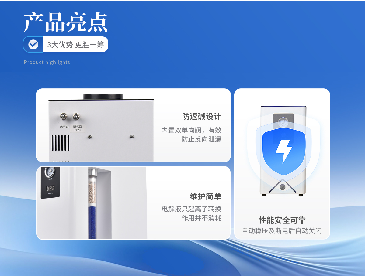 | 1、可取代高压氮气瓶,使实验室仪器化。 | 2、操作简便,只需启动电源开关,仪器即可产氮且输出压力稳定。 | 3、不消耗电解液;电解液只起离子转换作用并不消耗,所以只需补充因蒸发而损失的少量蒸馏水。 | 4、产气纯度高,空气经电解池分离后即可得到高纯氮气。 | 5、性能安全可靠:具有稳压和断电后自动关闭气路功能。 | 6、寿命长,既可间断使用,又可连续使用且产气量稳定、不衰减。 | 7、**节能:采用**的开关电源,提高了电解效率。 | 8、配有双单向阀,自动防返碱。 |