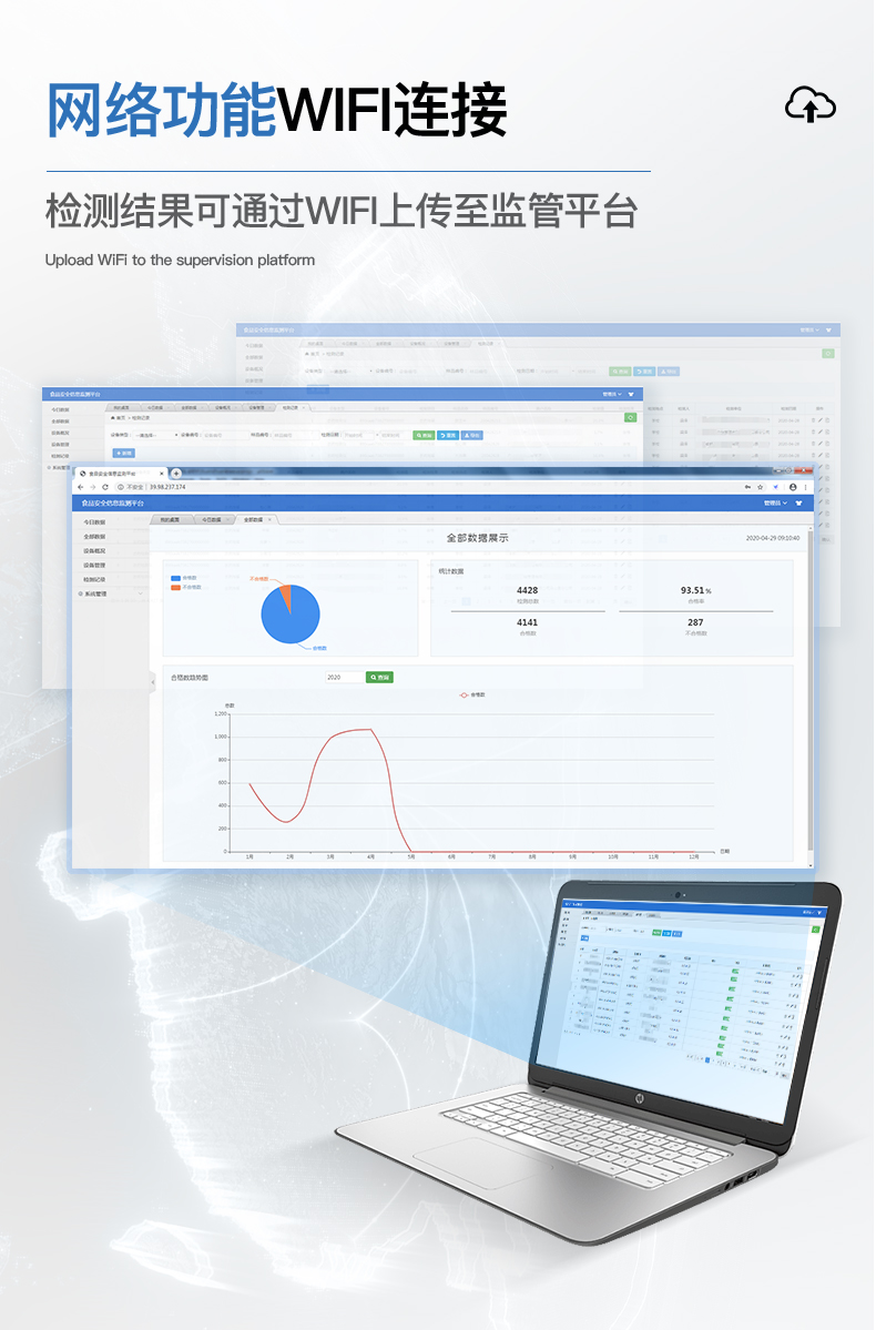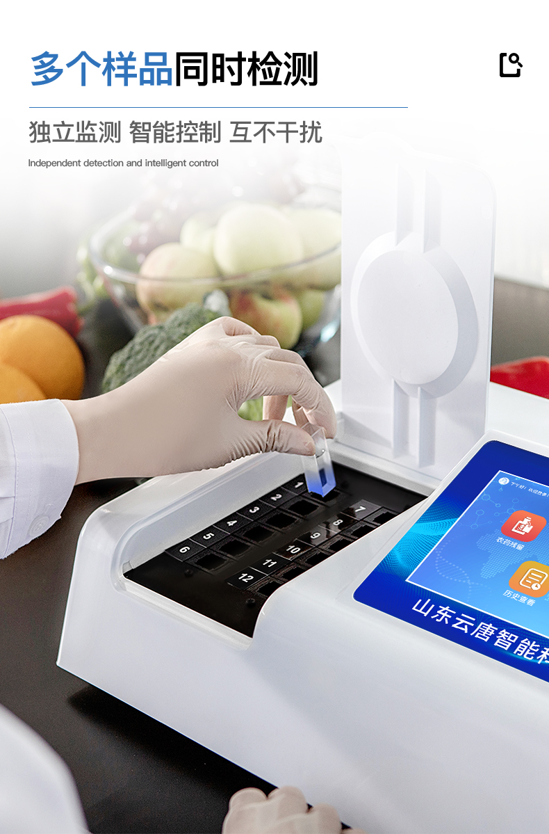 | 安卓智能操作系统,采用更加**和人性化操作,仪器具有网线连接、wifi联网上传、GPRS无线远传功能,快速上传数据。 | 智能化程度高,仪器具有自检功能:具有开机自检和调零功能,具有自动检测重复性功能。 | 检测通道:≥12个检测通道,可以同时测试多个样品,每个样品由程序控制分别独立工作,不会互相干扰。 | 显示方式:≥8英寸液晶触摸屏显示,人性化中文操作界面,读数直观、简单。 | 配备新一代嵌入式热敏打印机,可选择手动打印或者自动打印,检测完成可自动打印检测报告和二维码。 | 光源采用进口超高亮发光二极管,高精度、稳定性强、光源可控、可以关掉不使用的光源,功耗更低。 | 采用USB2.0接口设计,方便数据的存贮和移动,并可随时与计算机直接相连,并且可用计算机控制仪器。实现数据查询、浏览、分析、统计、打印等。 | 仪器带有监管平台。数据可局域网和互联网数据上传,检测结果直接传至食品安全监管平台。进行区域食品安全监管及大数据分析处理,检测区域食品安全长短期动态,达到食品安全问题预估、预警 | 一体化便携式快检设备,满足现场及流动检测使用需求,能够在同一软件下实现所有检测项目的检测,并可通过同一窗口直观显示检测结果。 | 仪器具有多品类多种类样品菜单库,可灵活选择检测样品,不同的检测通道可同时检测不同的样品项目。也可在仪器上直接编辑录入样品名称、检测指标、送检单位等信息并保存进样品数据库。 | 样品处理简单省力,整体操作快速、安全、便捷。 | 仪器具有自身保护功能,可设置用户名及密码,防止非工作人员操作等。 | 高灵敏度,高检测精度,高重复性精度,扫描式高精度光学传感器。 | 仪器具有重新校准、锁定、恢复出厂设置功能。 | 支持U盘存储。 结果判定线可修改,对照值标定值可保存,断电不丢失数据。 |