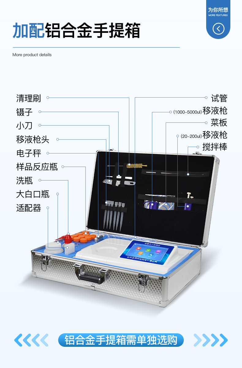 该多功能食品安全检测仪为集成化食品安全快速检测分析设备,广泛应用于食药监局、卫生部门、高教院校、科研院所、农业部门、养殖场、屠宰场、食品肉产品深加工企业、检验检疫部门等单位使用。