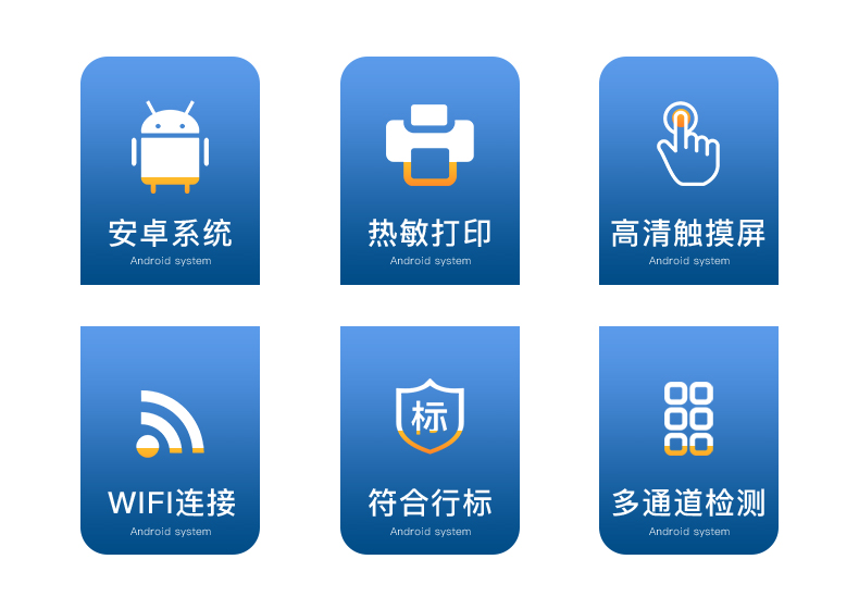 | 安卓智能操作系统,采用更加**和人性化操作,仪器具有网线连接、wifi联网上传、GPRS无线远传功能,快速上传数据。 | 智能化程度高,仪器具有自检功能:具有开机自检和调零功能,具有自动检测重复性功能。 | 检测通道:≥12个检测通道,可以同时测试多个样品,每个样品由程序控制分别独立工作,不会互相干扰。 | 显示方式:≥8英寸液晶触摸屏显示,人性化中文操作界面,读数直观、简单。 | 配备新一代嵌入式热敏打印机,可选择手动打印或者自动打印,检测完成可自动打印检测报告和二维码。 | 光源采用进口超高亮发光二极管,高精度、稳定性强、光源可控、可以关掉不使用的光源,功耗更低。 | 采用USB2.0接口设计,方便数据的存贮和移动,并可随时与计算机直接相连,并且可用计算机控制仪器。实现数据查询、浏览、分析、统计、打印等。 | 仪器带有监管平台。数据可局域网和互联网数据上传,检测结果直接传至食品安全监管平台。进行区域食品安全监管及大数据分析处理,检测区域食品安全长短期动态,达到食品安全问题预估、预警 | 一体化便携式快检设备,满足现场及流动检测使用需求,能够在同一软件下实现所有检测项目的检测,并可通过同一窗口直观显示检测结果。 | 仪器具有多品类多种类样品菜单库,可灵活选择检测样品,不同的检测通道可同时检测不同的样品项目。也可在仪器上直接编辑录入样品名称、检测指标、送检单位等信息并保存进样品数据库。 | 样品处理简单省力,整体操作快速、安全、便捷。 | 仪器具有自身保护功能,可设置用户名及密码,防止非工作人员操作等。 | 高灵敏度,高检测精度,高重复性精度,扫描式高精度光学传感器。 | 仪器具有重新校准、锁定、恢复出厂设置功能。 | 支持U盘存储。 结果判定线可修改,对照值标定值可保存,断电不丢失数据。 |