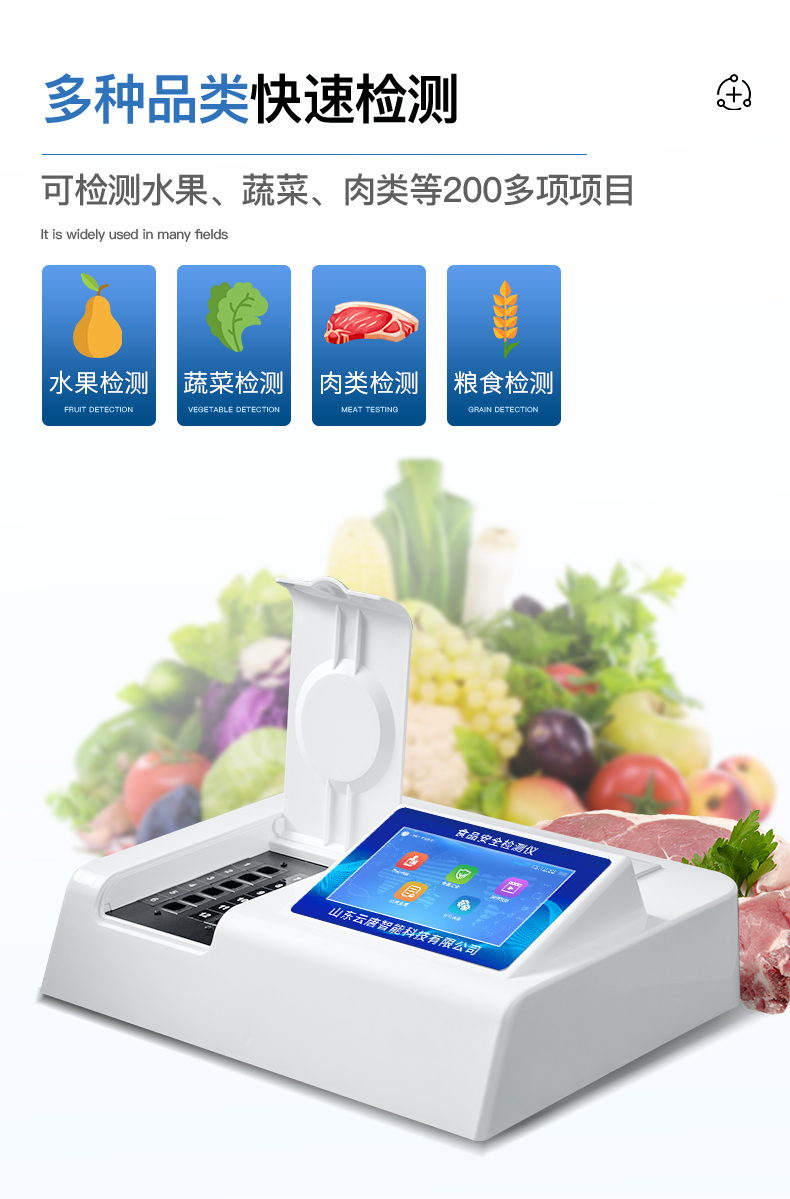 可快速检测各类食品中的甲醛、吊白块、二氧化硫、亚硝酸盐、双氧水、硼砂、农药残留、乳及乳制品中蛋白质、硝酸盐、重金属铅的含量,仪器预留其他项目检测程序和端口,根据日后需求可方便的自主增加检测项目。