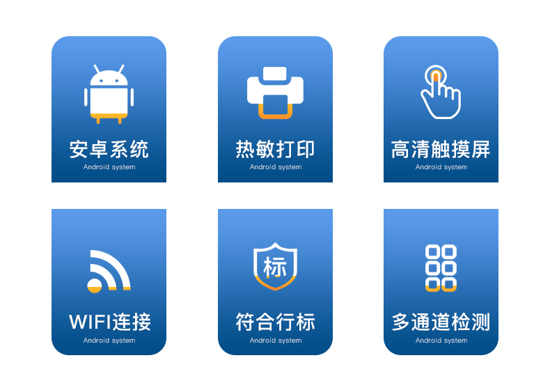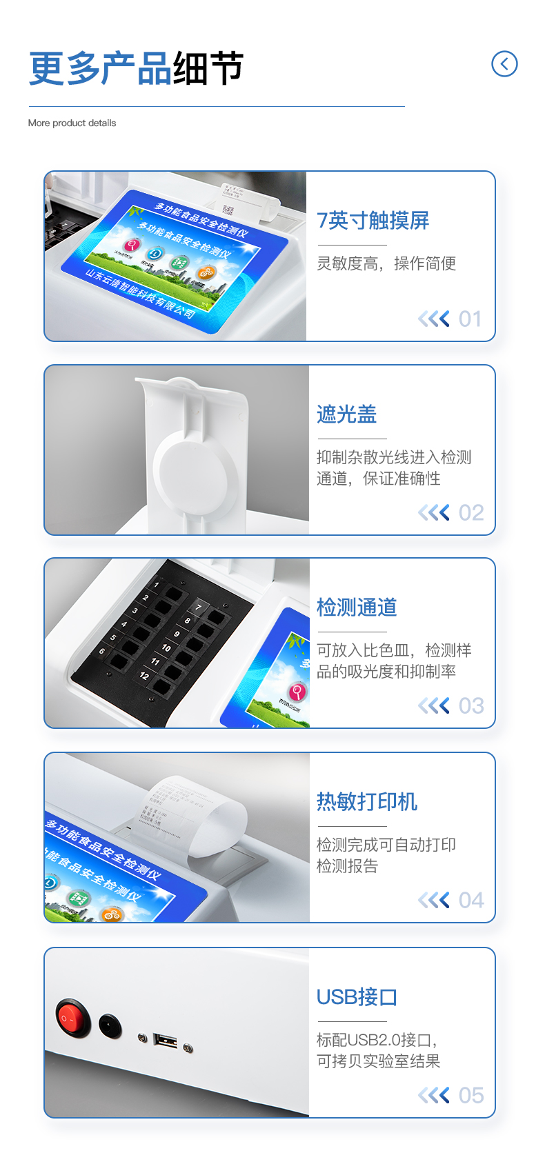 | 安卓智能操作系统,采用更加**和人性化操作,仪器具有网线连接、wifi联网上传、GPRS无线远传功能,快速上传数据。 | 能够在同一软件下实现所有检测项目的检测,并可通过同一窗口直观显示检测结果。 | 智能化程度高,仪器具有自检功能:具有开机自检和调零功能,具有自动检测重复性功能。 | 检测通道:≥12个检测通道,可以同时测试多个样品,每个样品由程序控制分别独立工作,不会互相干扰。 | 显示方式:≥7英寸液晶触摸屏显示,人性化中文操作界面,读数直观、简单。 | 配备新一代嵌入式热敏打印机,可选择手动打印或者自动打印,检测完成可自动打印检测报告和二维码。 | 光源采用进口超高亮发光二极管,高精度、稳定性强、光源可控、可以关掉不使用的光源,功耗更低。 | 采用USB2.0接口设计,方便数据的存贮和移动,并可随时与计算机直接相连,并且可用计算机控制仪器。实现数据查询、浏览、分析、统计、打印 |