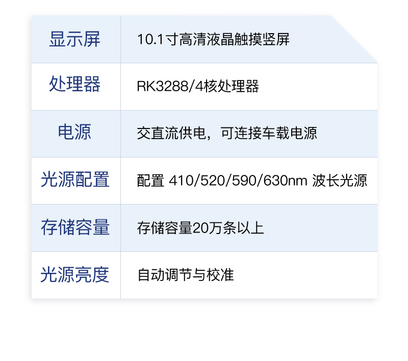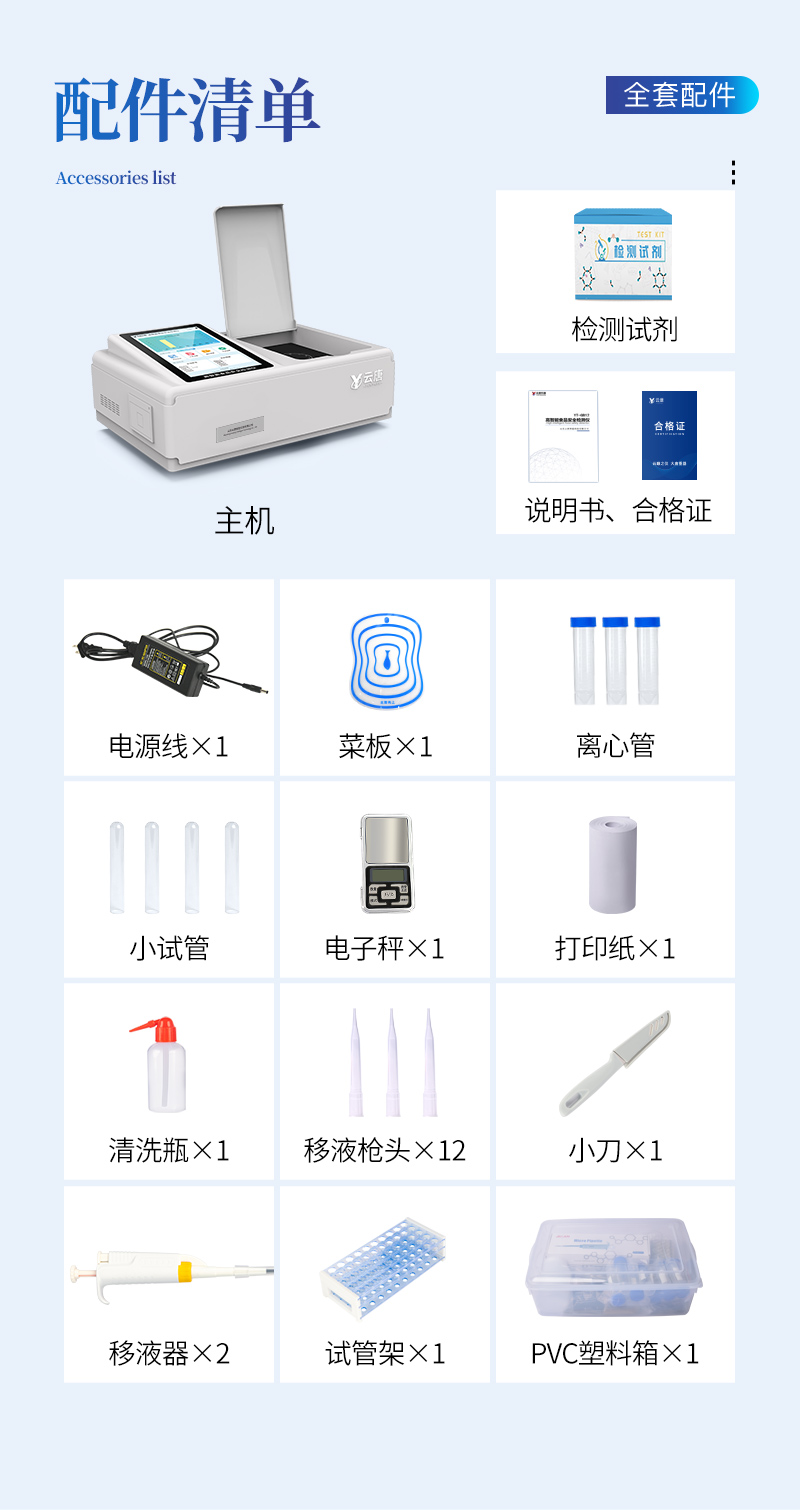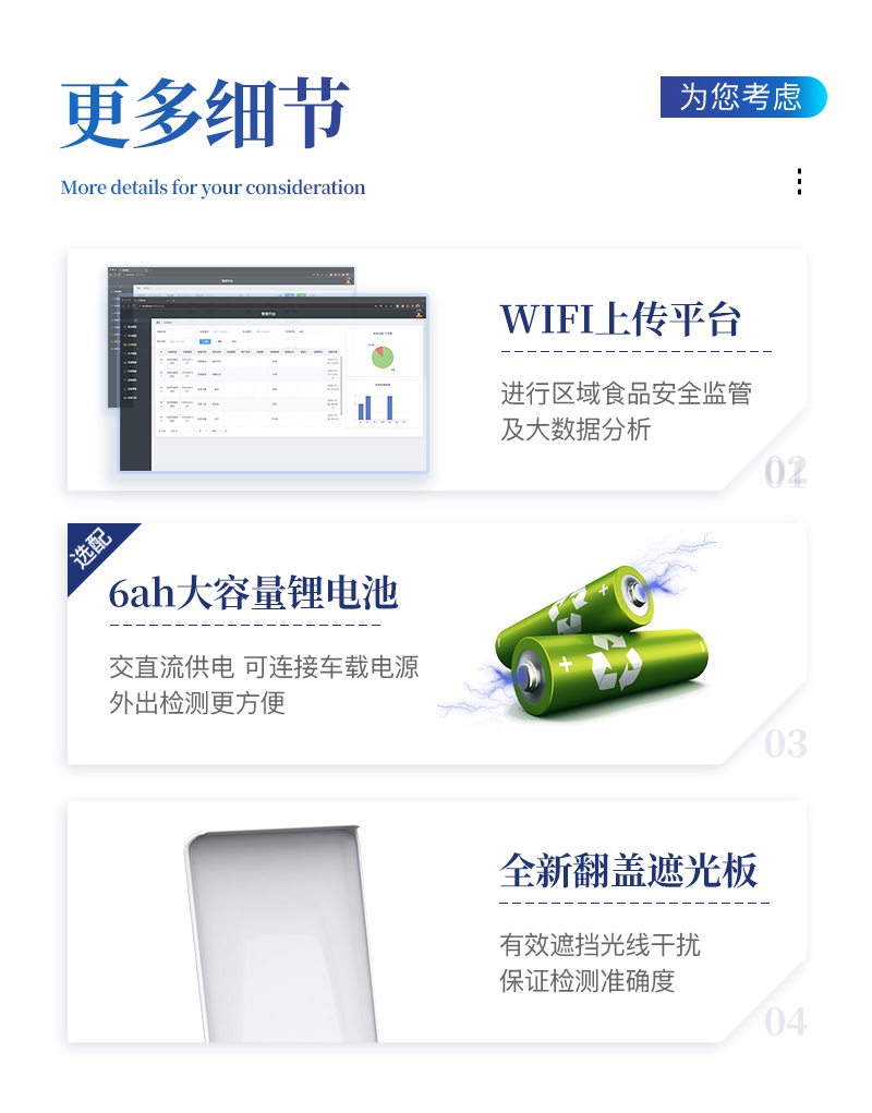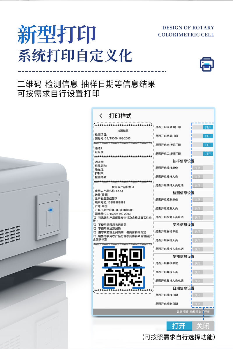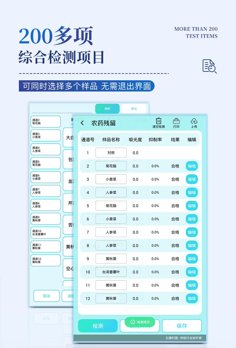 | 仪器采用台式一体化系统检测技术,将分光光度模块、新型农残检测模块、数字化管理模块、无线通讯模块高度集成于一体,支持检测200种食品安全检测项目,同时预留升级检测方法。 | 仪器检测模块标准化、智能化,可随意自由组合。检测箱体内置多个标准检测单元,检测模块可以调整配置。 | 仪器采用全新安卓智能系统,主控芯片采用 ARM Cortex-A7,RK3288/4核处理器,10.1寸高清液晶触摸竖屏,更加**的UI交互界面,运转快捷;仪器配备无线通信模块: 4G(APN)通讯模块、Wifi模块,蓝牙传输,同时具有双USB接口以及RJ45接口能以多种方式实现数据保存和数据传输功能。 | 创新检测模式: | ★检测通道:≥12通道;采用精密旋转比色池设计,使用同芯片同光源校准精度,解决不同光源之间的误差值。1-12通道间误差0.1%。(***:**202022821055.2) | ★仪器具有自动识别比色皿检测功能,即:将样品比色皿放入仪器后,点击样品检测,仪器自动识别比色皿进行通道检测。 | 进口高精光源: | 高精度进口四波长冷光源,通道配置 410、520、590、630nm 波长光源,一个光源芯片驱动一个光源,误差极小,每台设备单独**校准光源,**比对,同时参照四种不同波段光源全方位覆盖市面上99%的农残食品项目检测。 | 智能化操作系统: | 便捷操作系统:设备检测时可在同一检测界面自动对应相关检测通道一次性选择1-12个样品名称,无须退出界面,节省操作时间。 | 数据集成系统:设备首页自动统计检测数据包含:周检测数据、月检测数据,全部检测总数量,均包含检测总数,合格数,不合格数,以及相关柱形分析图,对各项检测数据清晰掌握,无需电脑查询,更加快捷直观。 | 项目预设系统:支持添加单个及多个相同或不相同的任务预设,一键快速调取,每一个任务分别可以设置不同的样品、批次、编号、来源、备注、抽样信息、检测信息、受检信息、复核信息等更多信息。无缝链接平台和APP实时查看下发任务。 | 数据监管系统:同步对接监管平台,数据可局域网和互联网数据上传,检测结果可选择直接传至食品安全监管平台。集成OSS输出存储服务、区分设备定向管理应用,进行区域食品安全监管及大数据分析处理与数据统计,检测区域食品安全长短期动态,达到食品安全问题预估、预警。 | 自定义打印系统:内置全新打印系统,新创自定义打印方式,可按需灵活设置开启或关闭:产品合格证(国家农业部标准要求),二维码,抽样信息、检测信息,受检信息、复核信息、抽样日期、检测日期等信息的打印。 | 系统远程更新功能:可定向分客户分仪器更新系统,按照不同客户后期实际需求添加项目,无需机器返厂,即可远程实时升级全新系统,节省时间成本及避免运输造成设备损坏。 | 仪器主机采用一体化防水、抗压、防撞击、防腐蚀箱体设计,同时配备交直流供电,可连接车载电源,可选配大容量充电锂电池,满足现场野外检测需求。 | 安全证书,放心保障:仪器具有中国计量科学研究院校准证书,权威认证。 |