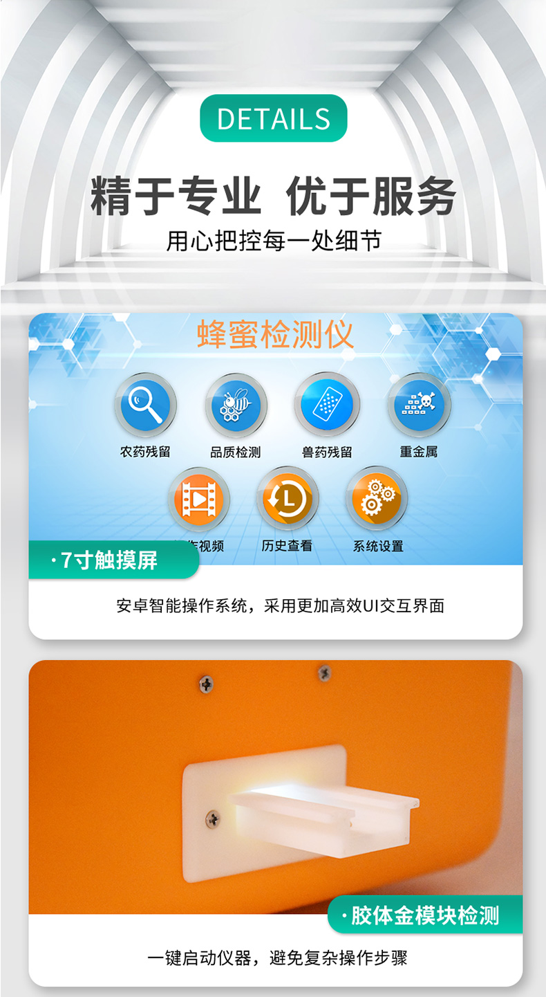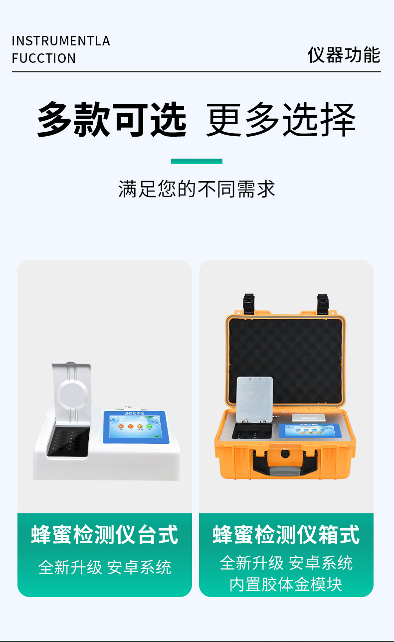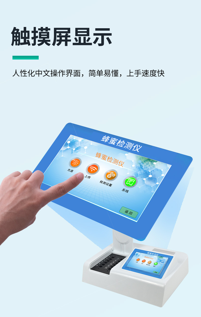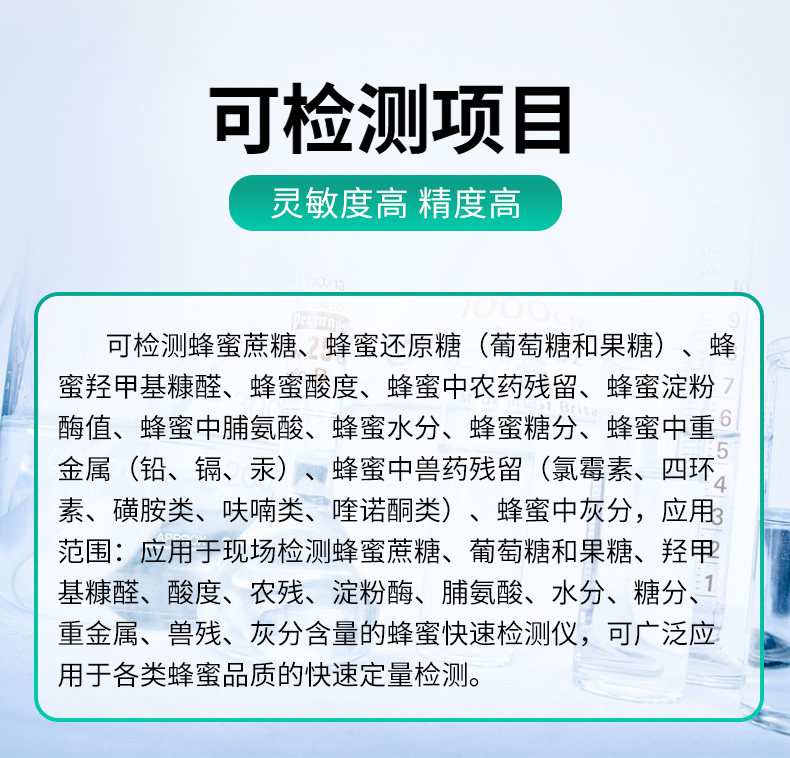 检测项目:蜂蜜蔗糖、蜂蜜还原糖(葡萄糖和果糖)、蜂蜜羟甲基糠醛、蜂蜜酸度、蜂蜜中农药残留、蜂蜜淀粉酶值、蜂蜜中脯氨酸、蜂蜜水分、蜂蜜糖分、蜂蜜中重金属(铅、镉、汞)、蜂蜜中抗生素(氯霉素、四环素、磺胺类、呋喃类、喹诺酮类)、蜂蜜中灰分,应用范围:应用于现场检测蜂蜜蔗糖、葡萄糖和果糖、羟甲基糠醛、酸度、农残、淀粉酶、脯氨酸、水分、糖分、重金属、抗生素、灰分含量的蜂蜜快速检测仪,可广泛应用于各类蜂蜜品质的快速定量检测。
