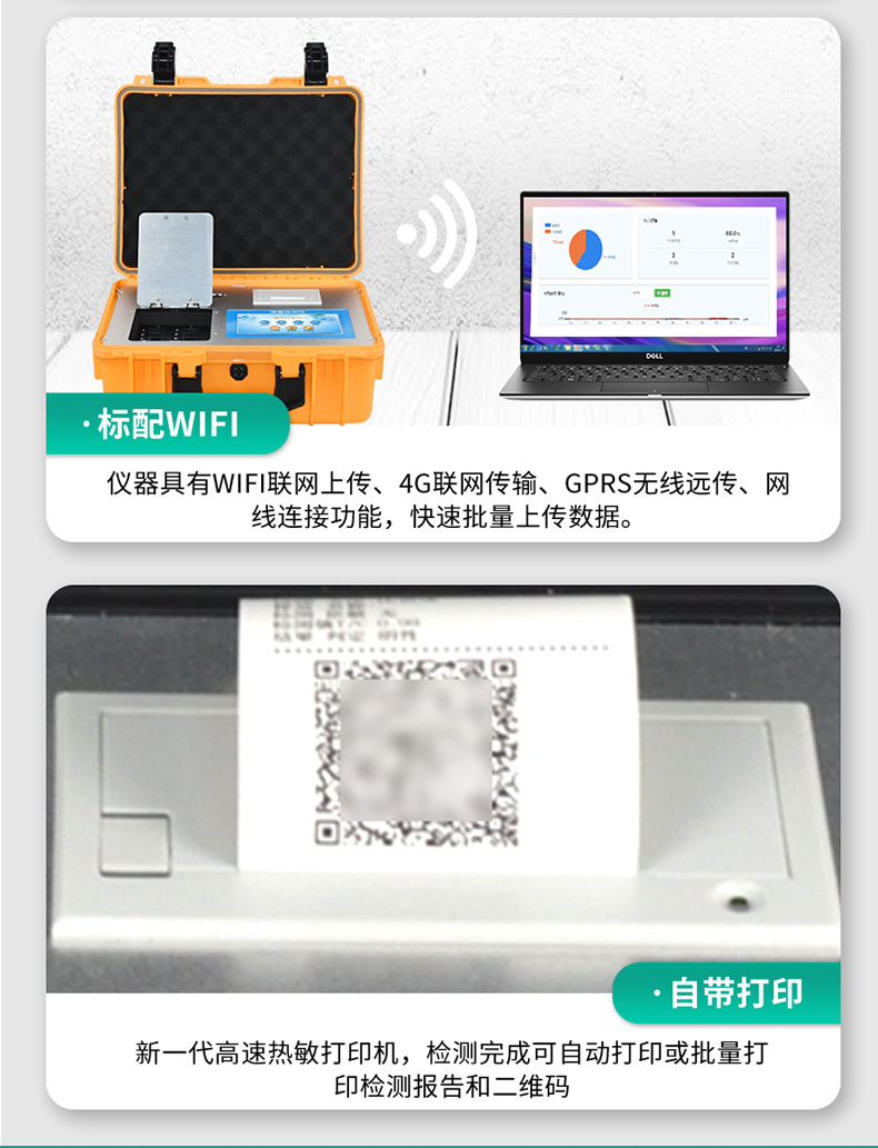 | 安卓智能操作系统,采用更加**UI交互界面,仪器具有wifi联网上传、4G联网传输、GPRS无线远传、网线连接功能,快速批量上传数据。 | 智能化程度高,仪器具有自检功能:具有开机自检和调零功能,具有自动检测重复性功能。 | 新一代高速热敏打印机,检测完成可自动打印或批量打印检测报告和二维码。 | 仪器带有监管平台,数据可局域网和互联网数据上传,检测结果直接传至食品安全监管平台。进行区域食品安全监管及大数据分析处理与数据统计,检测区域食品安全长短期动态,达到食品安全问题预估、预警 | 一体化主机,包含光电比色检测模块、胶体金免疫层析检测模块。 | 一体化便携式快检设备,满足现场及流动检测使用需求,能够在同一软件下实现所有检测项目的检测,并可通过同一窗口直观显示检测结果。 | 胶体金模块检测方式:轨道式自动传输扫描,检测完成后自动退出检测卡。 | CT线自动识别,无需手动调整。 | 仪器具有多品类多种类样品菜单库,可灵活选择检测样品,不同的检测通道可同时检测不同的样品项目。也可在仪器上直接编辑录入样品名称、检测指标、送检单位等信息并保存进样品数据库。 | 仪器内置操作视频,是您身边的化验指导专家。 | 样品处理简单省力,整体操作快速、安全、便捷。 | 仪器具有自身保护功能,可设置用户名及密码,防止非工作人员操作等。 | 高灵敏度,高检测精度,高重复性精度,扫描式高精度光学传感器。 | 仪器具有重新校准、锁定、恢复出厂设置功能。 | 结果判定线可修改,对照值标定值可保存,断电不丢失数据。 | 兼容市场上所有的胶体金卡,使用耗材不受限制,极大增强用户使用体验。 |