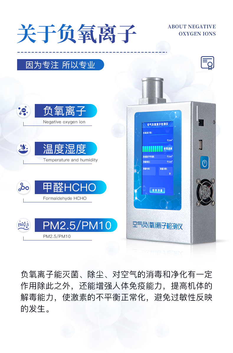 注意:由于环境中负氧离子不断产生、消失,维持动态稳定,总体上是稳定的,记录数据时应取多次采集平均值。
