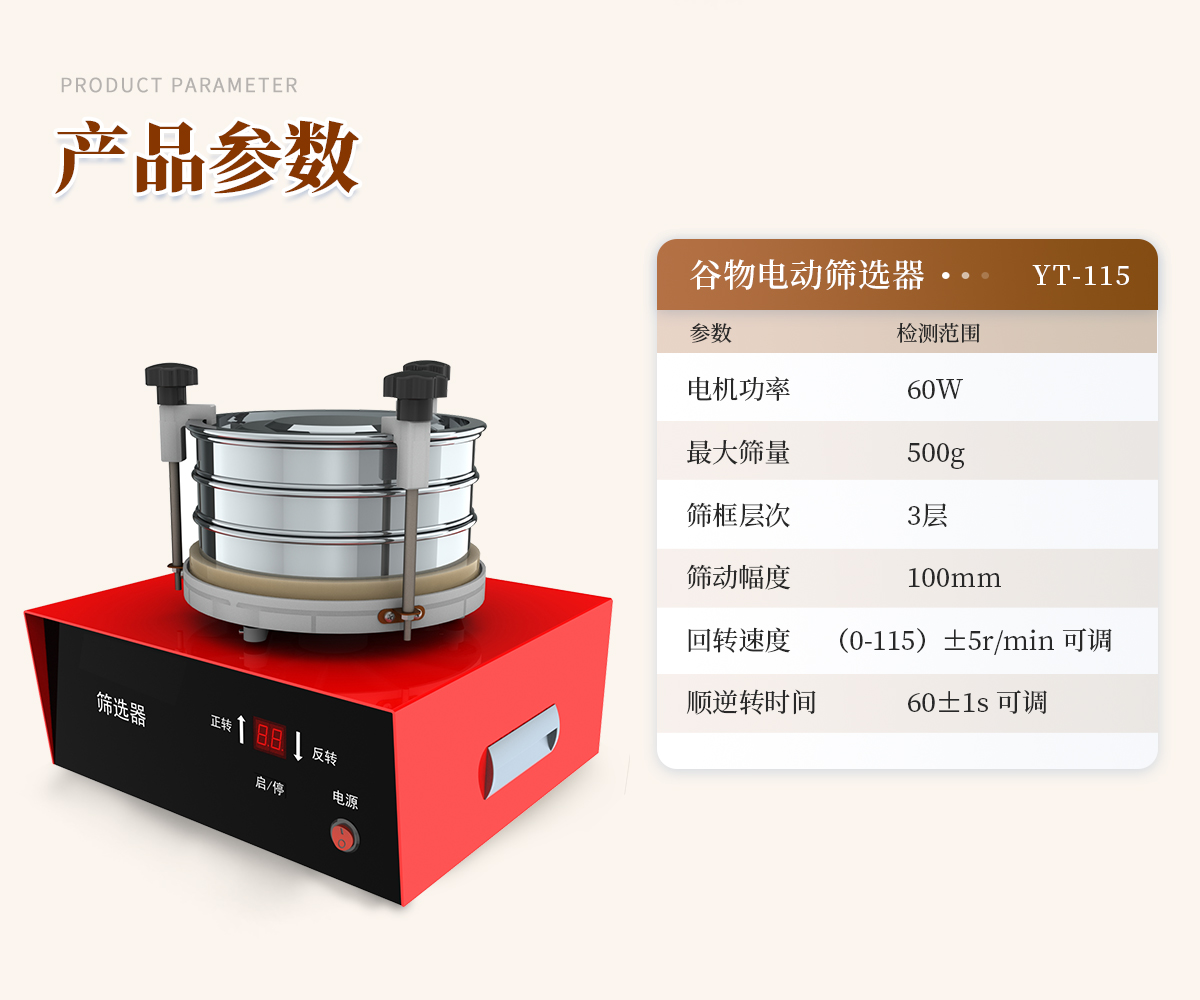 一、用途主要用于谷物选筛二、技术参数1、电机功率:60W;2、**筛量:500g;3、筛框层次:3层;4、筛动幅度:100mm;5、回转速度:(0-115)±5r/min 可调;6、顺逆转时间:60±1s 可调;     更新时间:2026-04-24
