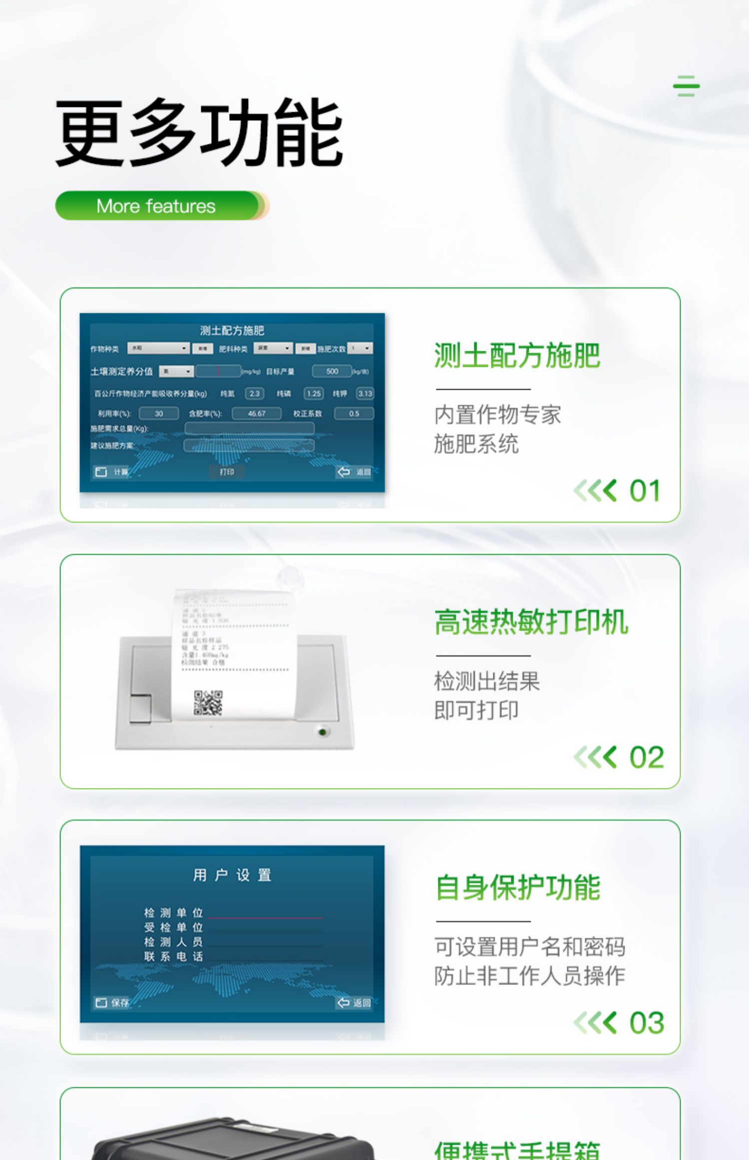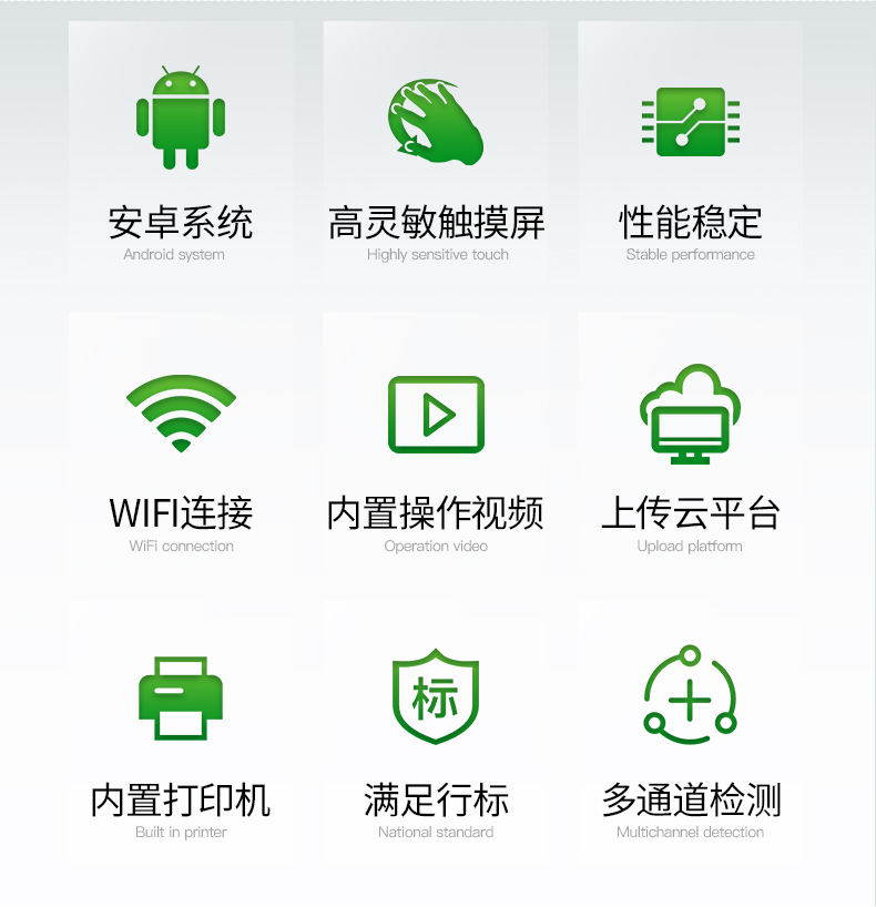 | Android安卓智能操作系统,主控芯片采用ARM Cortex-A7,RK3288/4核处理器,主频1.88Ghz,运转速度更快速,稳定性更强。 | 采用精密旋转比色池设计,光源一致性更加**,保证检测精度。 | 12个旋转检测通道,一次性可快速检测12个样品,极大提升检测效率,降低检测成本。 | 采用高精度滤光片技术自主专利分析方法(***:** 2018 2 1777724.7),权威认证。 | 检测过程中内置校准功能,智能恒流稳压,光强自动校准,确保检测准确度。 | 仪器标配wifi无线上传、4G联网传输、GPRS无线远传,快速上传数据。 | 配有云平台,仪器连入无线网络后,可将检测数据可选择性或批量无线上传,方便用户进行长期数据管理和可视化分析。 | 仪器配同时具有USB接口、以太网接口,内置大容量内存,并可随时用U盘拷贝数据。 | 可用手机随时登录云平台在线移动查看历史数据 | 4波长专业测试冷光源(红、蓝、绿、橙),光源波长稳定,长时间连续工作光源无温漂现象,寿命长达10万小时级别,重现性好,准确度高。 | 比色池部分采用标准1cm比色皿,无机械位移及磨损,光路测试定位**,有效屏蔽外光干扰,保证检测结果优于国标要求。 | 仪器系统内带有样品前处理操作视频,各种样品检测方法点击视频模块即可观看,检测人员无需自学说明书,指导教学方便快速,方便新手快速操作 | 内置新一代高速热敏打印机(无需色带),打印内容包含:检测单位、检测人员、检测项目、通道号、吸光度、含量(mg/kg)、检测时间、以及二维码等信息 | 高灵敏7寸真彩触摸屏,采用更加**和人性化操作,高清晰高交互显示,大程度降低传统仪器的繁琐操作和失误。 | 内置时钟功能,方便操作时间记录,长期历史追溯。 | 可设置多账户账号密码登录,**UI交互界面,不同的用户可自由添加编辑检测信息,保存后可长期使用。 | GPS功能:可在野外作业时记录经纬度地点,满足特殊用户需求。 | 内置低电压提示功能,可在检测时明确电量,避免测试数据偏移,同时具有断电保护功能,断电自动保存数据,防止数据丢失。 | 交直流两用供电方式,内置大容量充电锂电池,满电状态下可连续工作10余小时,同时可外接车载电源蓄电。 | 仪器具有中英文切换功能,可满足出口要求。 | 高强度PVC工程塑料手提箱设计,坚固耐用,便于携带。 |