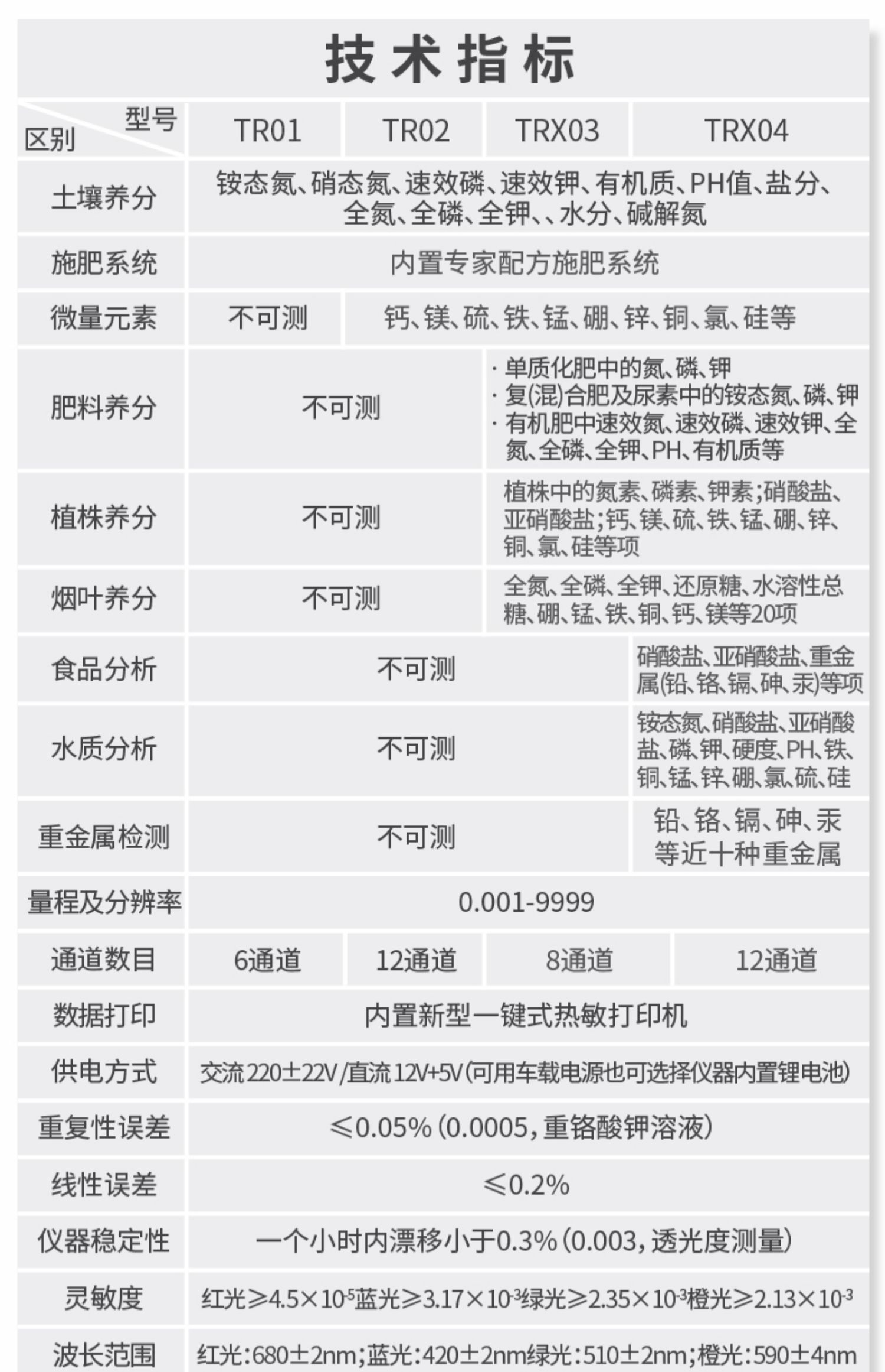 | 电源:交流 220±22V 直流 12V+5V(仪器内置锂电池也可用车载电源) | 功率: ≤5W | 量程及分辨率:0.001-9999 | 重复性误差: ≤0.02%(0.0002,重铬酸钾溶液) | 仪器稳定性:一个小时内显示数字无漂移(透光度测量);两个小时内数字漂移不超过0.3%(0.003,透光度测量)、0.001(吸光度测量)。 | 线性误差: ≤0.1%(0.001,硫酸铜检测) | 灵敏度:红光≥4.5 ×10-5 蓝光≥3.17×10-3 绿光≥2.35×10-3 橙光≥2.13×10-3 | 波长范围 :红光:680±2nm; 蓝光:420±2nm; 绿光:510±2nm;橙光:590±4nm | 显示屏分辨率:1024*600 | 抗震等级:IP65 | 仪器尺寸:48×34.5×22cm | 主机净重:5.2kg |