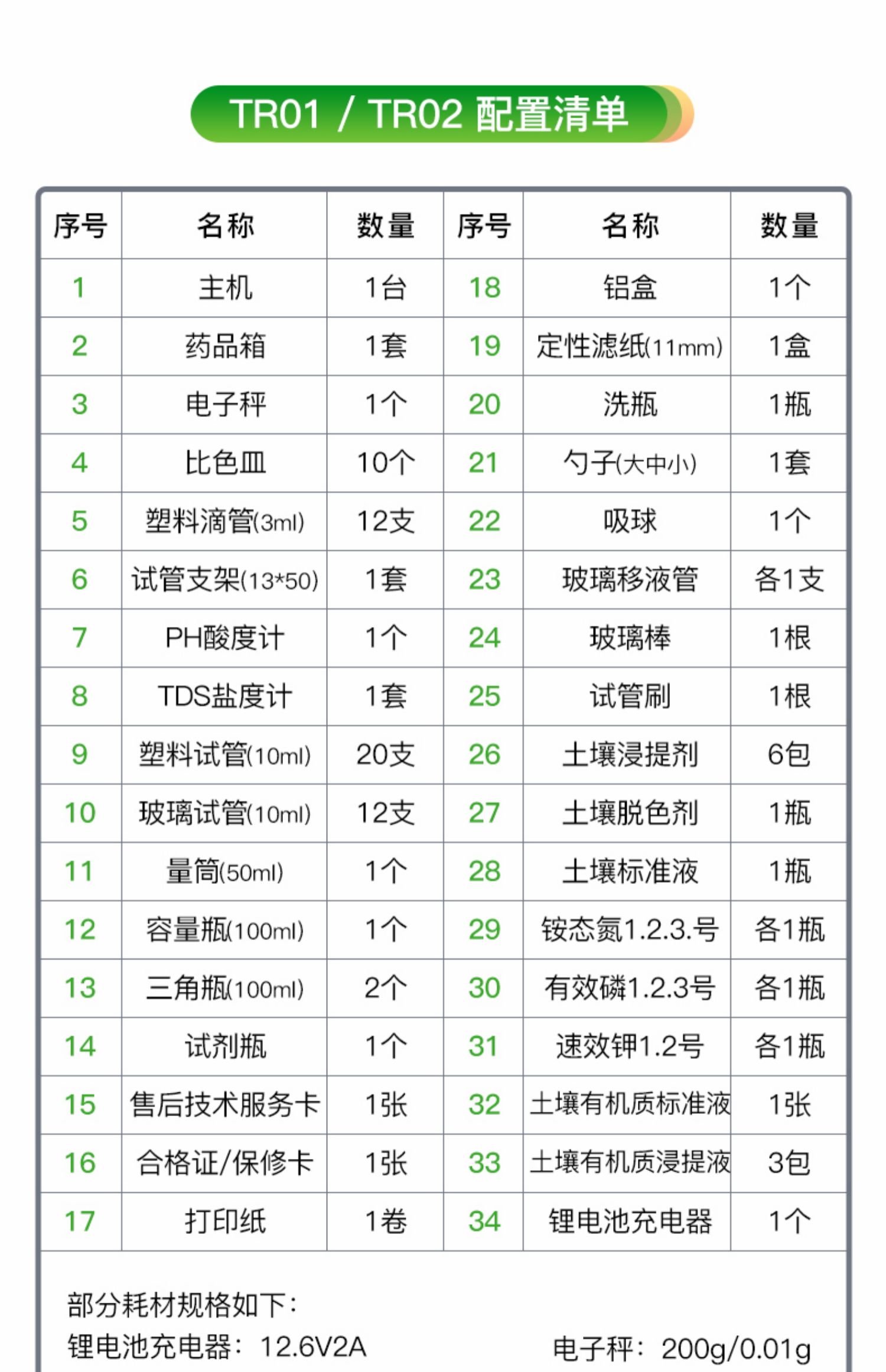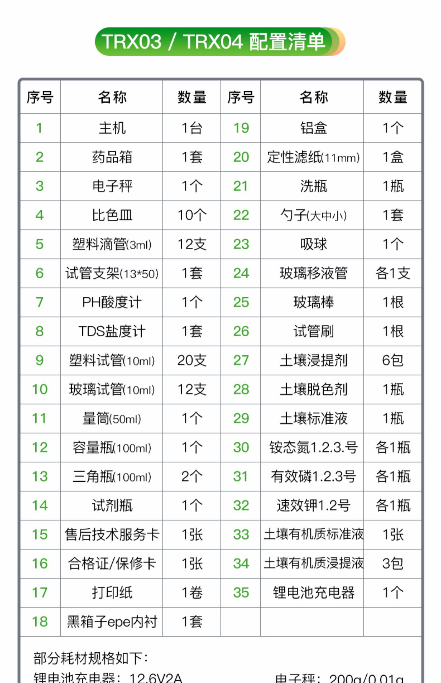 | 名称 | 配件箱 | 重金属试剂 | 定性滤纸 | 比色皿 | 玻璃试管 | 塑料试管 | 三角瓶 | 试剂瓶 | 量筒 | 塑料滴管 | 试管架 | 试管刷 | 洗瓶 | 称量勺 | 电源适配器 | TDS计 | PH试纸 |