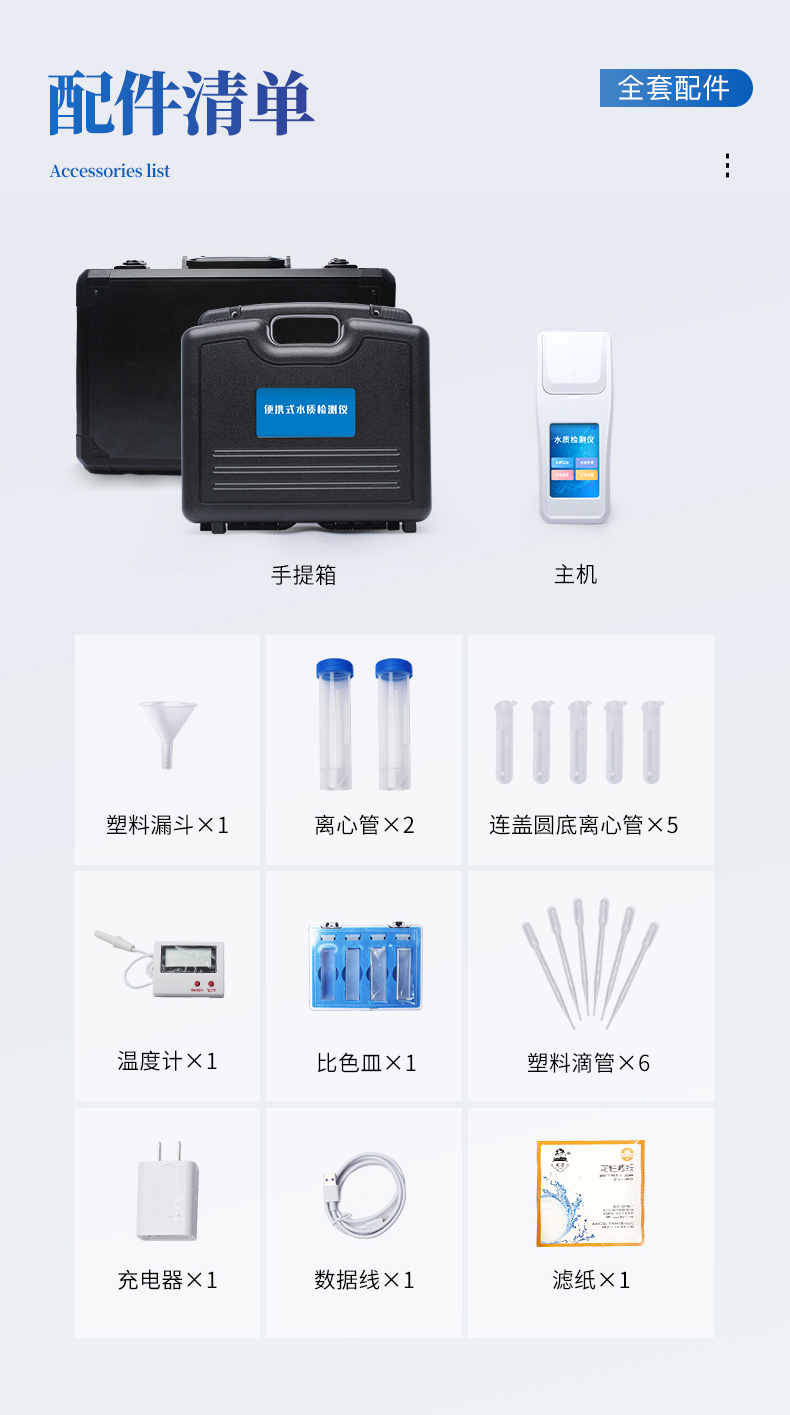 | 仪器主机1台 | 量杯1只 | 离心管2只 | 连盖圆底离心管5只 | 塑料漏斗1只 | 比色皿1盒 | 塑料滴管6只 | 滤纸1盒 | 数据线1根 | 充电器1个 |