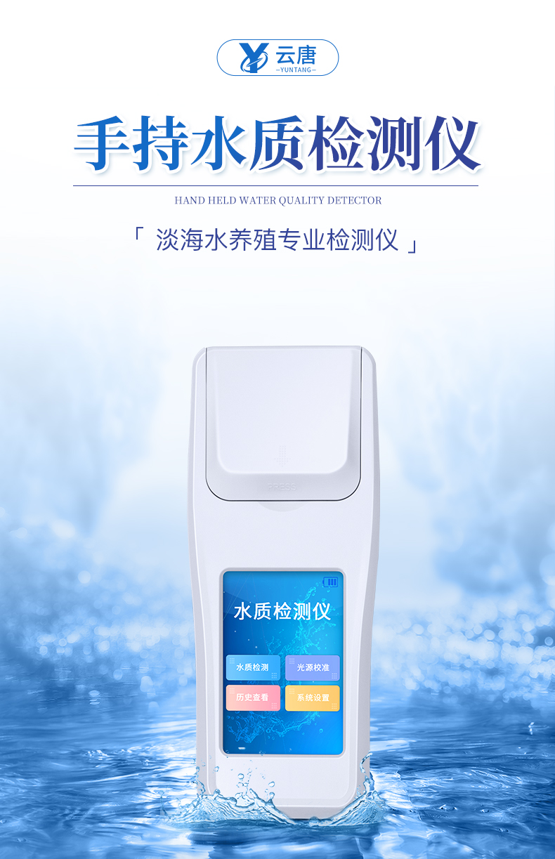 云唐YT-SS9型便携式水质检测仪是一款适用于工业污水、水产养殖、河流监测、游泳场馆等领域的检测仪,配合快速显色检测试剂,可“快速、简单、准确、稳定”进行测量,拥有精美的外观造型,简单的操作界面,准确的检测系统,帮助用户获得精细的数据,可更准确、有效的分析水体状况,提前预防养殖风险,及时避免损失。