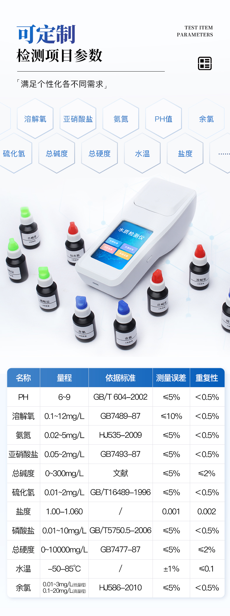 | 参数名称 | pH | 溶解氧 | 氨氮 | 亚硝酸盐 | 总碱度 | 硫化氢 | 盐度 | 磷酸盐 | 总硬度 |