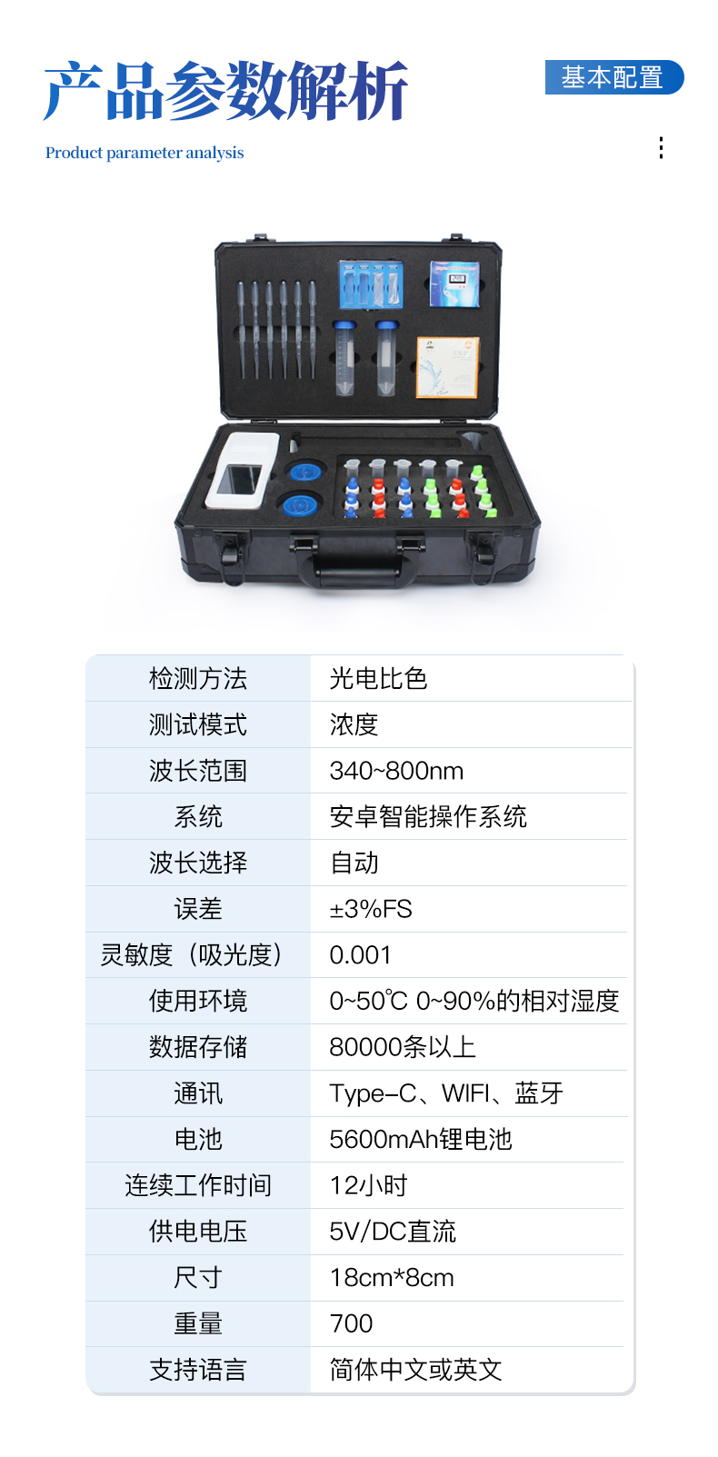 | 检测方法:光电比色 | 测试模式:浓度 | 波长范围:340~800nm | 系统:安卓智能操作系统 | 波长选择:自动 | 显示屏幕:3.5寸彩色液晶屏 | 稳定性:<0.5% | 灵 敏 度(吸光度):0.001 | 使用环境:0~50℃ 0~90%的相对湿度 | 数据存储:80000条以上 | 通讯:Type-C、WIFI、蓝牙 | 电池:5600mAh锂电池 | 连续工作时间:12小时 | 供电电压:5V/DC直流 | 尺寸:18cm*8cm | 重量:700g | 支持语言:简体中文或英文 |