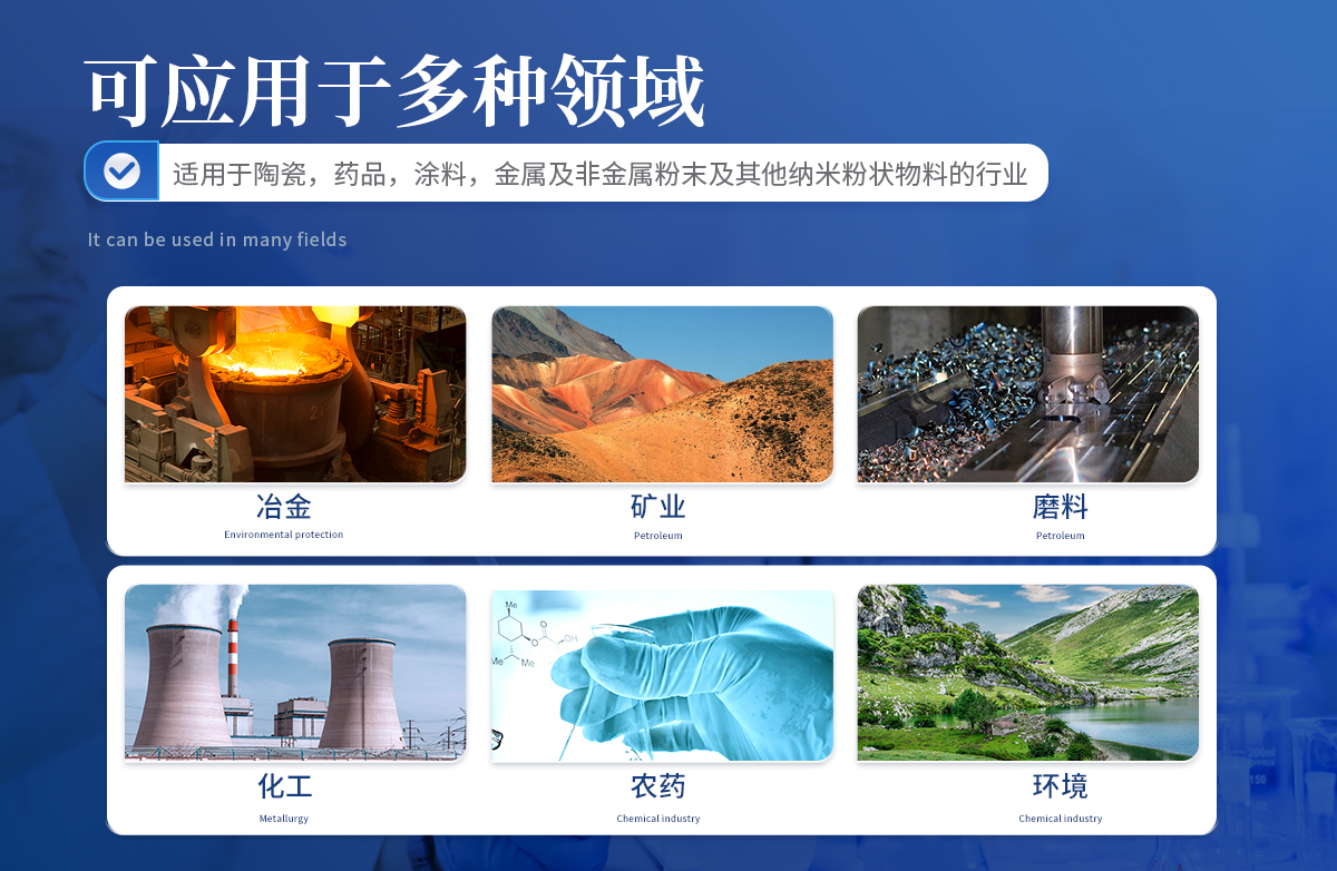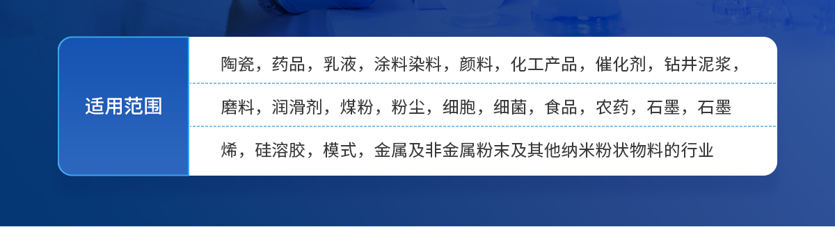 YT-QJLS-2000广泛应用于水泥、陶瓷、药品、乳液、涂料、染料、颜料、填料、化工产品、催化剂、钻井泥浆、磨料、润滑剂、煤粉、泥砂、粉尘、细胞、细菌、食品、添加剂、农药、炸药、石墨、感光材料、燃料、墨汁、金属与非金属粉末、碳酸钙、高岭土、水煤浆及其他粉状物料。
