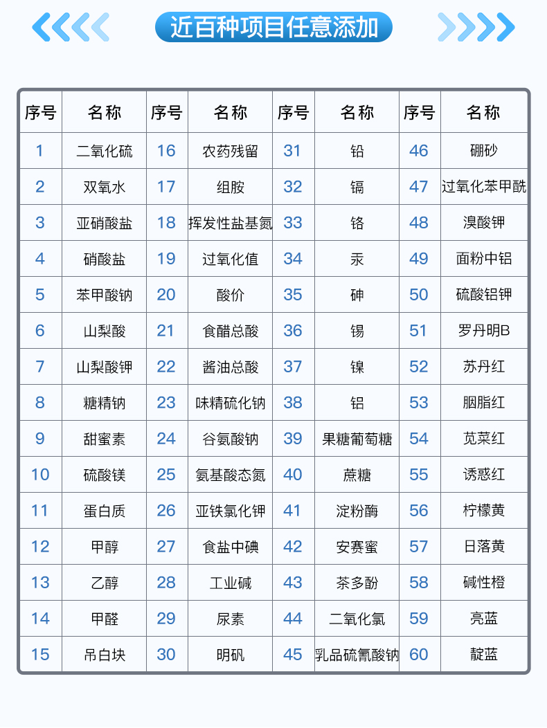 检测项目:可快速定量检测各类食品中的甲醛的含量,仪器预留其他项目检测程序和端口,根据日后需求可方便的自主增加检测项目。日后可升级为检测,水产品,肉制品,面制品的综合类型仪器。