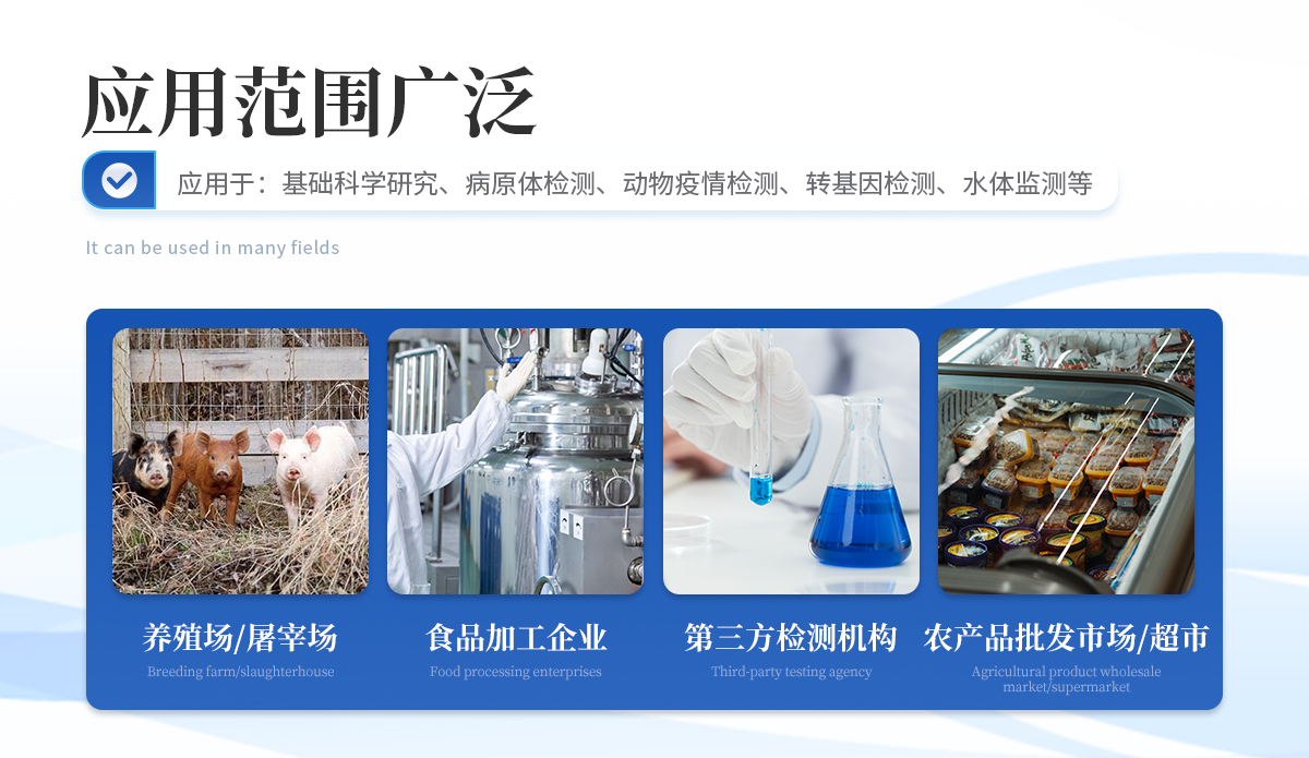 | 1、食品安全: 致病微生物、农兽药残留、生物毒素等快速筛查。 | 2、畜牧兽医: 动物疫病诊断、动物源性安全指标检测。 | 3、环境监测: 水质、土壤特定污染物筛查。 | 4、科研与生物安全: 免疫层析实验定量分析、生物因子检测。 | 5、其他领域: 所有使用胶体金免疫层析试纸条的场景。 |