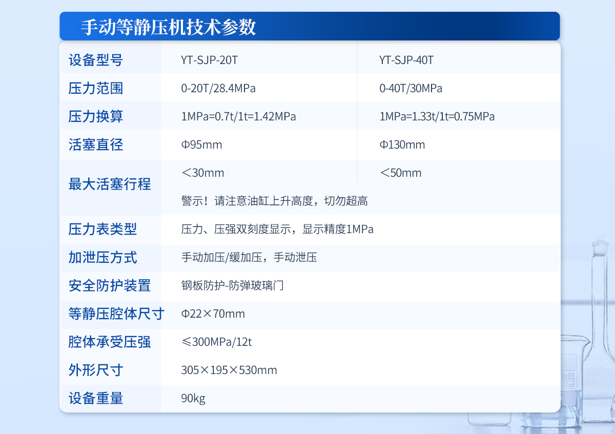 | 规格型号:YT-ZJP-60T | 压力范围:0.5-60T/0.1t | 活塞直径 :Φ150mm | **油缸行程:<50mm | 加压方式:自动加压/缓加压 | 加压制样过程:自动加压--自动保压--精准补压--定时泄压 | 加压段数:5段任意设置 | 保压时间 :不限时N秒,每段均可设置不同的保压时间 | 控制面板:XNNETS 7寸 触摸液晶屏(远程控制可选配) | 触屏功能模块: 压力系-统-数据管理系统--中英文界面互换等(USB可升级) | 模具压强换算:实时自动计算样品承受压强(MPa) | 油缸限位保护:当油缸上升触碰到限位开关时自动泄压 | 系统安全配置:当系统压强超过安全值时自动泄压 | 安全防护装置:钢板防护+防弹玻璃门+漏电保护+急停开关 | 设备电源:220V(50Hz/60Hz) | 设备**功率:400W | 等静压腔体尺寸:Φ50×150mm | 腔体承受压强:≤300MPa/60t | 外形尺寸:300×500×680mm | 设备重量:240kg | 配置说明:等静压机1台!可根据需求定制500MPa等静压机或橡胶模具 |