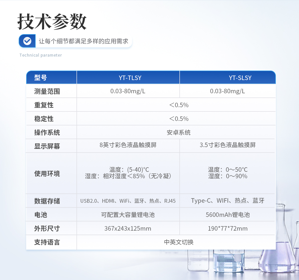 示值误差:≤±5%; 仪器稳定性:<0.5%; 仪器重复性:<0.5%; 光化学稳定性:20min内数值漂移≤0.002A(10万小时寿命); 参考标准:GB/T 11893-1989; 测定范围:0.03-80mg/L(分段,预制试剂); 检测下限:0.03mg/L; 检测时间:单个样品<10min;