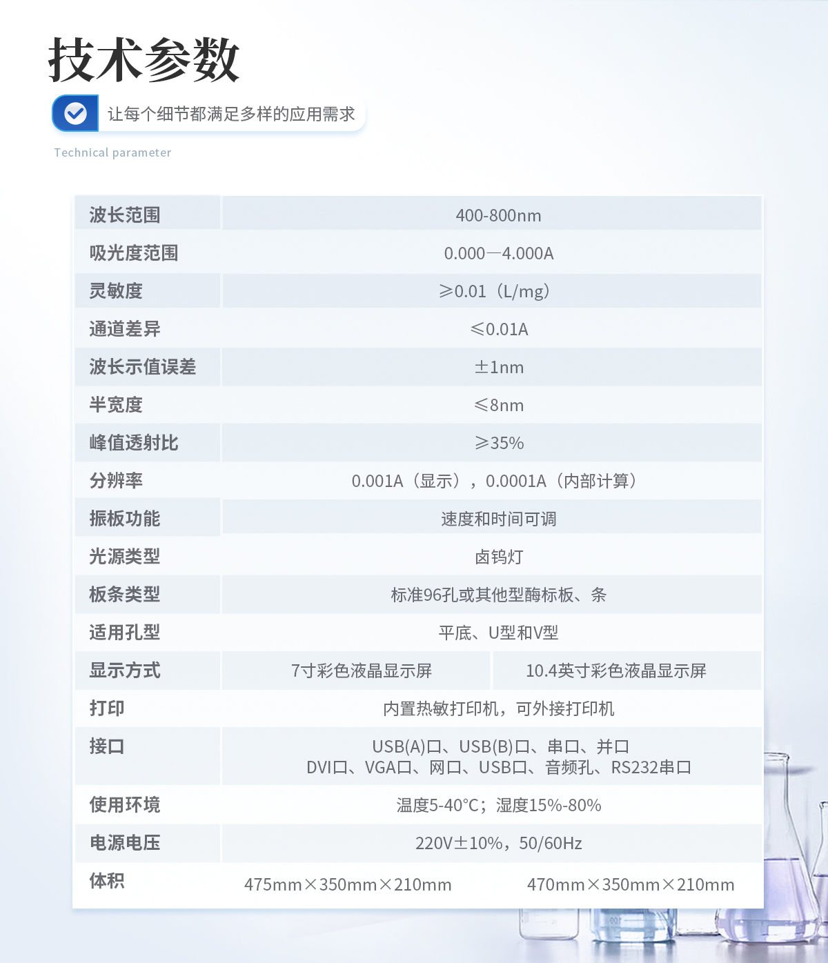 | *波长范围: 400-800nm | *滤光片配置:10个滤光片位置,标配405nm、450nm、492nm、630nm,选配6定制波长 | 吸光度范围:0.000―4.000A | *光通道数:8通道光路检测,另设一个独立参比通道(选配) | *示值稳定性:≤±0.002A或≤0.5%T/10min。 | *示值误差(准确性):≤±0.005A或±0.2%T。 | *重复性:≤0.2%或≤0.2%T。 | 灵敏度:≥0.01(L/mg)。 | 通道差异:≤0.01A。 | 波长示值误差:±1nm | 半宽度:≤8nm | 峰值透射比:≥35% | 分辨率:0.001A(显示),0.0001A(内部计算) | *读板速度:单波长≤3秒/96孔,双波长≤6秒/96孔 | 振板功能:速度和时间可调 | 光源类型:卤钨灯 | 板条类型:标准96孔或其他型酶标板、条 | 适用孔型:平底、U型和V型 | 显示方式:7寸彩色液晶显示屏显示 | 输入方式:触摸屏输入,可选配鼠标和键盘 | 打印:内置热敏打印机,可外接打印机 | 接 口: USB(A)口、USB(B)口、串口、并口 | *数据储存:200,000个测试数据,500个以上测试项目(可扩展) | 使用环境:温度5-40℃;湿度15%-80% | 电源电压:220V±10%,50/60Hz | 体积:475mm×350mm×210mm(长×宽×高) | 重量:11.5Kg |