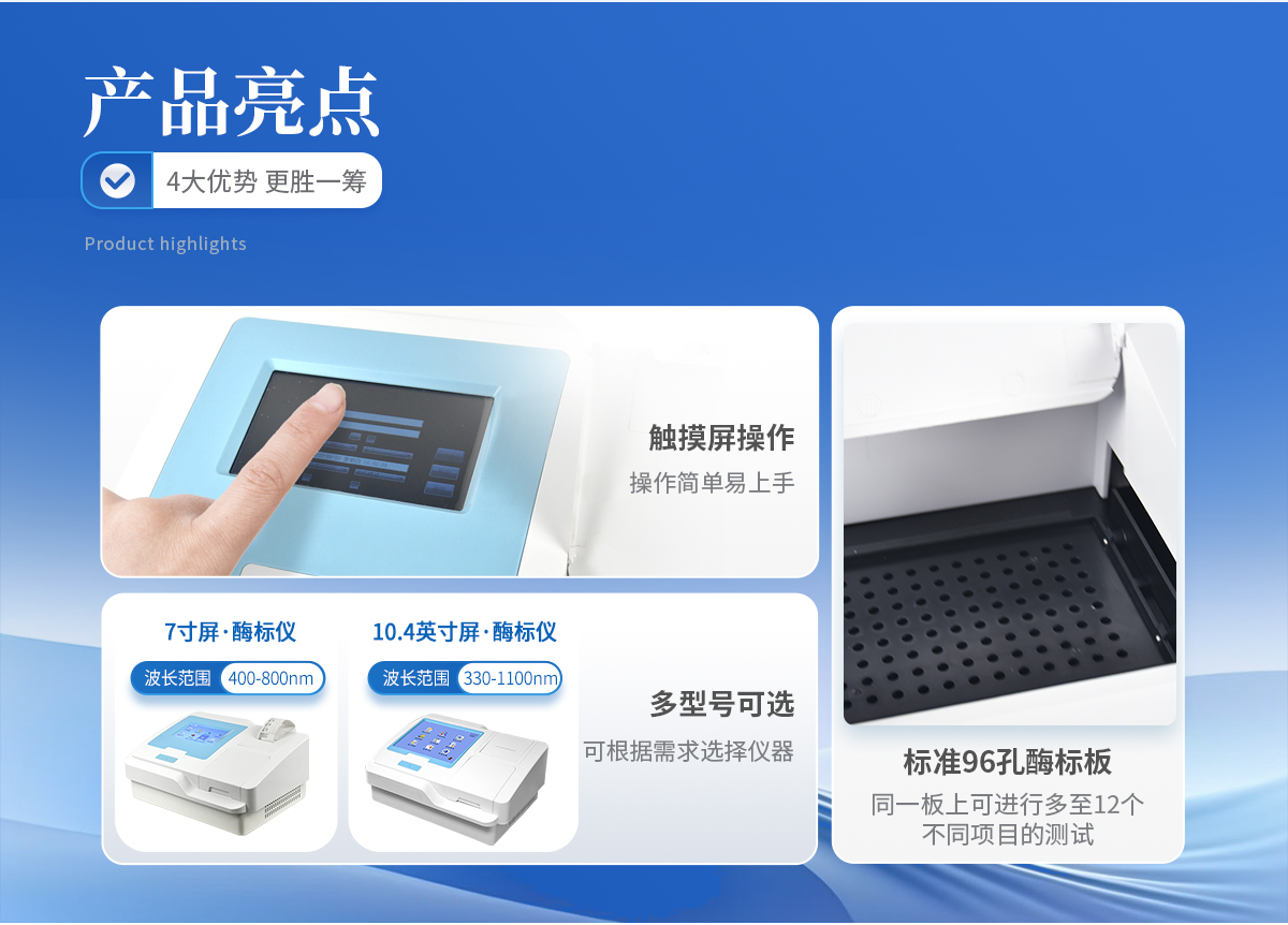 | 1. 内置嵌入式系统,无需外接电脑即可操作、存储、打印; | 2. 全屏显示96孔整板数据, 直观的可视化布板操作界面 | 3. 便捷的触摸屏输入,另可选配外接鼠标和键盘 | 4. 测量模式:单波长检测,双波长检测,两点法,动力学法,酶抑制率,终点法、速率法。 | 5. 可选择吸光度、Cut-Off定性计算、单点定标、折线回归、线性回归、指数回归、对数回归、双对数回归、log-logit、幂回归、四参数回归、酶抑制率等计算方法; | 6. 在同一板上可进行多至12个不同项目的测试,并可同一板检测定性和定量项目。 | 7. *全面完善的质控功能,包含westguard多规则质控,即刻法质控等多种质控图及质控参数计算,具有质控报警功能。 | 8. 具有灵活的定性公式输入功能,满足各种相同及不同试剂的不同的参数设置。 | 9. 布板和保存导入功能,大幅提高常用项目的测试效率 | 10. 可选配外接PC软件,网络化支持,迎合数字化发展方向,可定制上传。 | 11. 全新风格彩色图形化界面,全中文操作系统,支持鼠标、键盘,支持输入法。 | 12. 光源智能开关,延长其寿命。 | 13. 提供多种打印方式及多种形式中文报告,并可定制各式报告。 | 14. 专用系统维护菜单,自动判断仪器当前状态及性能指标,并可打印相关数据 |