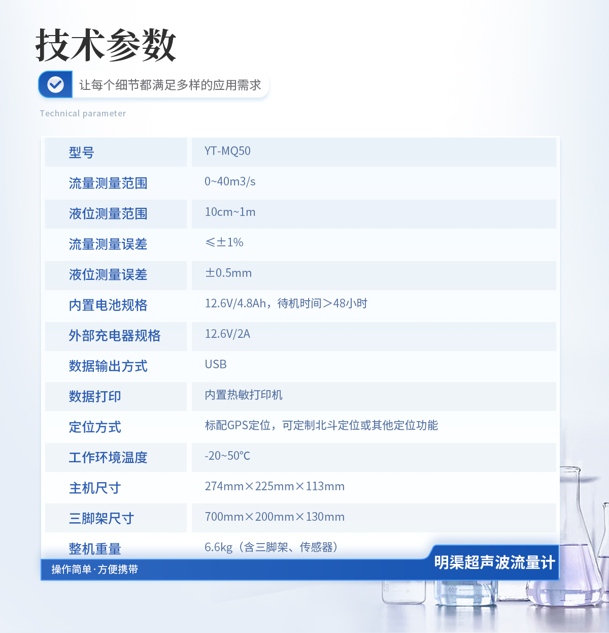 流量测量范围 0~40m³/s 流量测量频次 3次/秒 液位测量误差 ≤0.5mm 流量测量误差 ≤±1% 液位分辨率 0.1mm 探测距离 标配1米,可选配2米 信号输出方式 USB 工作环境湿度 ≤85% 工作环境温度 -20℃~+50℃v 工作电源 AC220V ±15% 内置电池 16.8V/2.6Ah 电池供电连续工作时间 >72 小时 外形尺寸 270mm×215mm×105mm 整机重量 2.4Kg