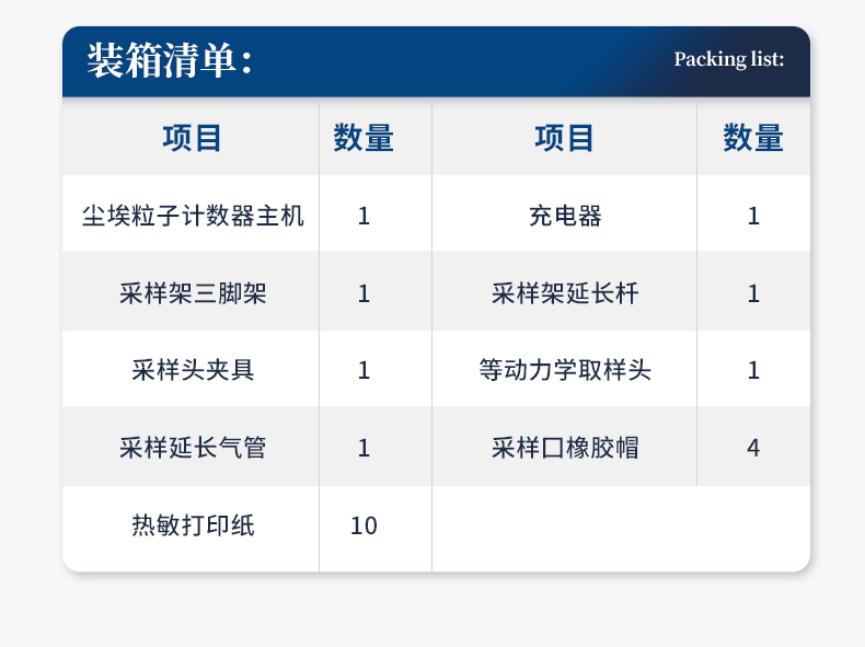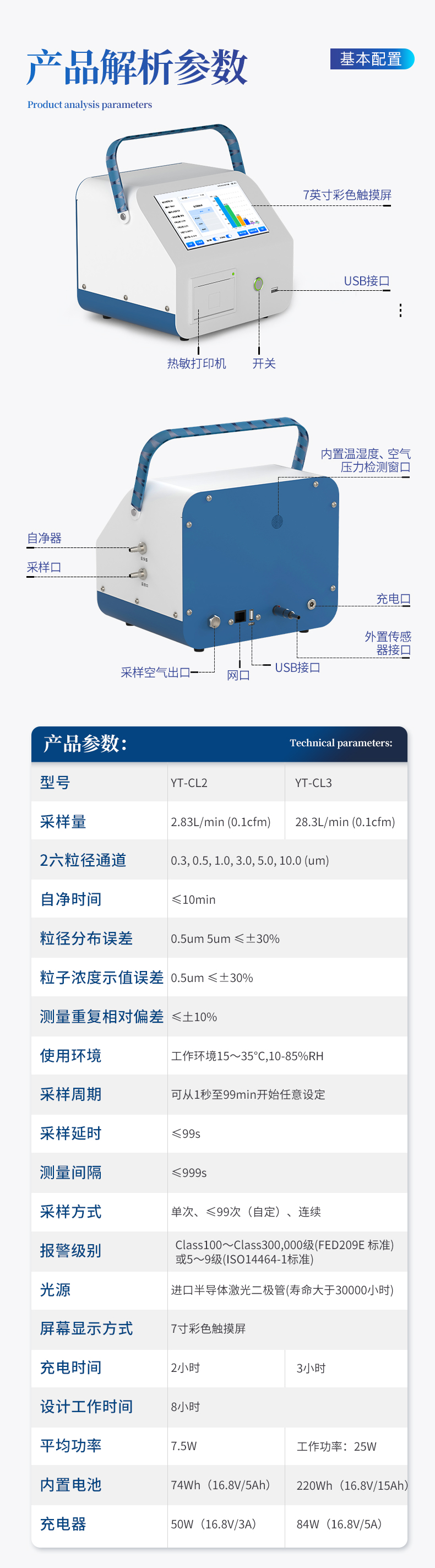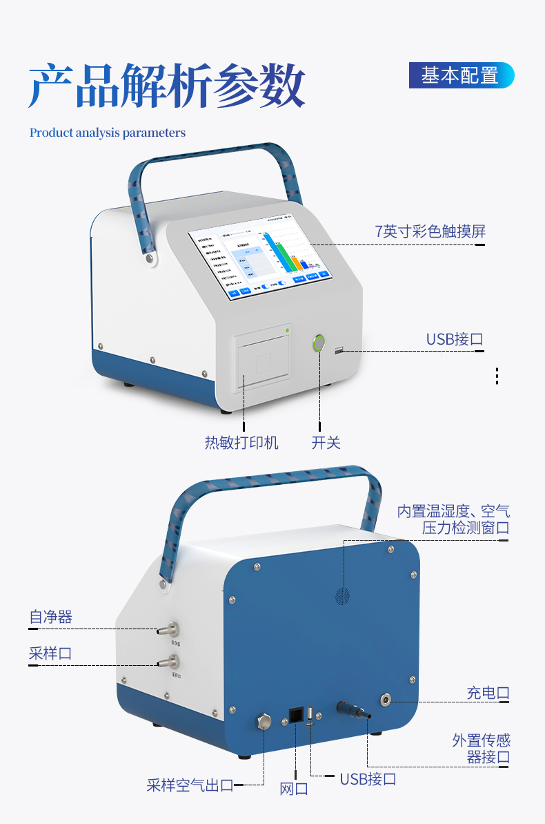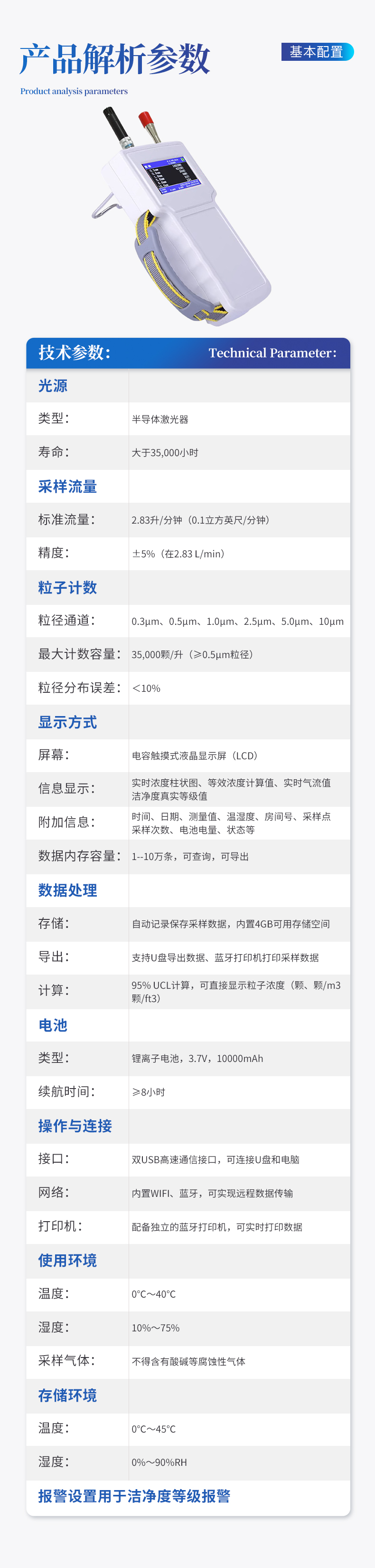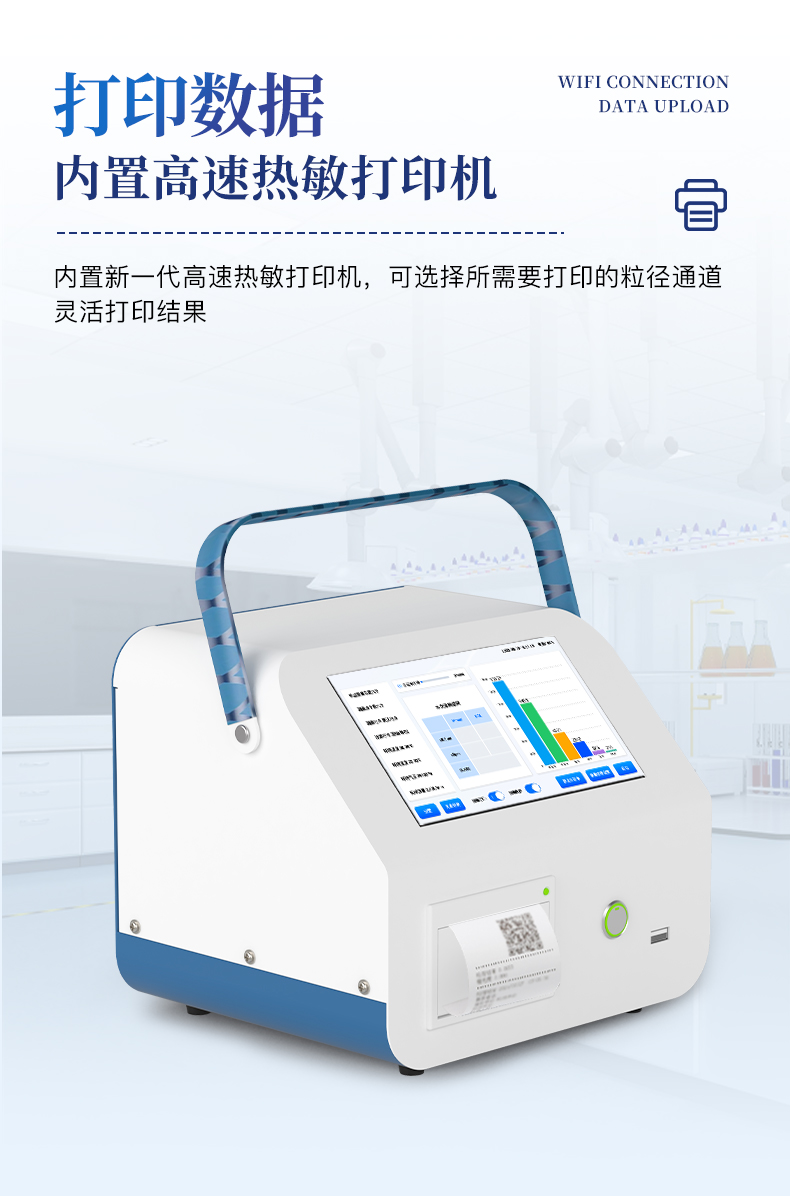 采样量:2.83L/min (0.1cfm) 六粒径通道:0.3,0.5,1.0,3.0,5.0,10.0(μm) 自净时间:≤10min 粒径分布误差:0.5um 5um ≤±30% 粒子浓度示值误差:0.5um ≤±30% 测量重复相对偏差:≤±10% 使用环境:工作环境15~35℃, 10-85%RH 采样周期:可从1秒至30000秒开始任意设定 采样延时:≤60s 测量间隔:≤60s 采样方式:单次、≤99次(自定)、连续 报警功能:通过设置报警参数实现颗粒数报警 光源:进口半导体激光二极管(寿命大于30000小时) 屏幕显示方式:7寸彩色触摸屏 数据内存容量:1--10万条,可查询,可导出。 充电时间:2小时 设计工作时间:8小时 平均功率:7.5W 内置电池:74Wh(16.8V/5Ah) 充电器:50W(16.8V/3A)