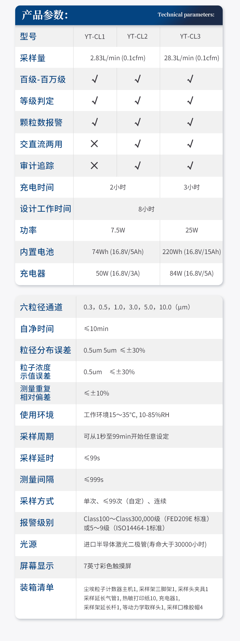 采样量:2.83L/min (0.1cfm) 六粒径通道:0.3,0.5,1.0,3.0,5.0,10.0(μm) 自净时间:≤10min 粒径分布误差:0.5um 5um ≤±30% 粒子浓度示值误差:0.5um ≤±30% 测量重复相对偏差:≤±10% 使用环境:工作环境15~35℃, 10-85%RH 采样周期:可从1秒至30000秒开始任意设定 采样延时:≤60s 测量间隔:≤60s 采样方式:单次、≤99次(自定)、连续 报警功能:通过设置报警参数实现颗粒数报警 光源:进口半导体激光二极管(寿命大于30000小时) 屏幕显示方式:7寸彩色触摸屏 数据内存容量:1--10万条,可查询,可导出。 充电时间:3小时 设计工作时间:8小时 工作功率:25W 内置电池:220Wh(16.8V/15Ah) 充电器:84W(16.8V/5A)