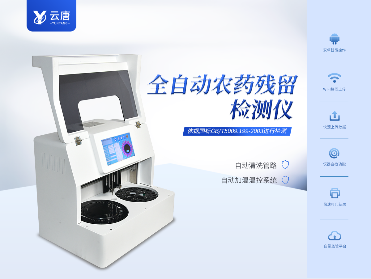 云唐全自动农药残留检测仪YT-NY2000,检测标准:依据****方法(GB/T5009.199-2003)以及世界卫生组织WHO、世界粮农组织FAO残留农药检测标准、世界环境保护局EPA参照摄入量等要求来设计。采用酶抑制率比色法对水果、蔬菜等农林产品中有机磷和氨基甲酸酯类农药含量进行快速准确的检测。