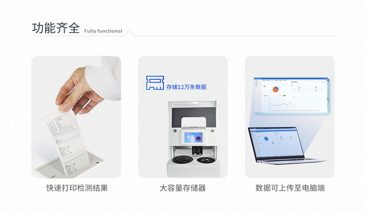 | 人性化界面,操作方便 | 仪器按照试剂要求自动、按时、按量加入试剂,提高工作效率 | 仪器自动对未正常放置的样本或异常的样本进行检查并提示 | 采用**的冷光源,保证了光源的稳定性及数据的准确性 | 大容量存储器,能存储12万条数据,满足客户需求 | 内置微型热敏打印机,快速打印检测结果,方便数据留存 | 可通过数据线连接电脑,将检测的数据上传至电脑端 | 仪器可自动清洗管路,避免试剂污染 | 仪器检测消耗试剂量和常规仪器一致 | 仪器具有自动加温温控系统 |