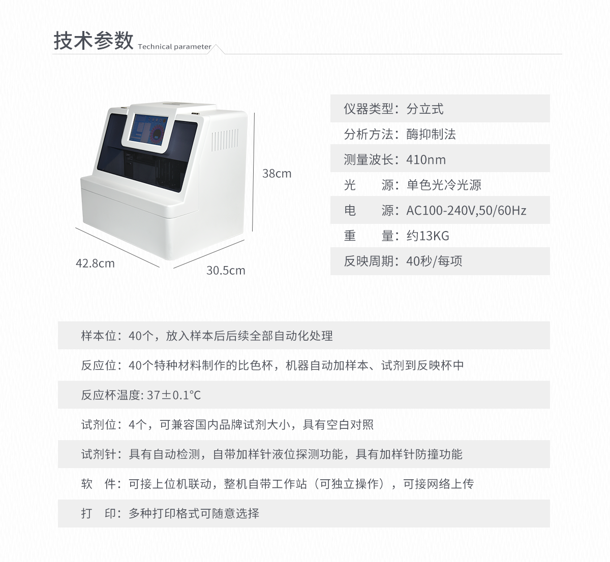 | 波长配置:410 | 试 剂 针:3根 | 检测通道:20个 | 反应温度:37℃,仪器具有自动加温温控系统 | 触 摸 屏:7寸触摸屏,可单机操作 | 比 色 皿:容量 0 - 4.5ml | 试 剂 盒:配套试剂存放盒,可整体取出 | 清洗功能:可自动清洗试剂管路,避免试剂污染 | 加样功能:仪器按照试剂要求自动、按时、按量加入试剂,提高工作效率 | 自动混匀:仪器测试过程中自动震荡混匀保证试剂充分反应 | 实时监控:仪器测试过程中显示实时运行状态 | 打印功能:内置热敏打印机,可快速打印检测结果,方便数据留存 | 数据存储:大容量存储器,能存储12万条数据 | 数据接口:外接USB接口,网线接口 | 网络连接:可连接有线网络和无线wifi | 上位机软件:仪器配套电脑端上位机软件,可通过软件进行写入参数及读取数据 | 样本检测:仪器自动对未正常放置的样本或异常的样本进行检查并报警提示 | 试剂检测:仪器测试前和测试过程中时刻对试剂进行检查,检查试剂是否缺失,如有异常仪器会进行报警提示,对已经加入试剂的样本进行正常测试,不影响测试结果,对未测试的样本停止测试。 | 数据上传:仪器数据可传入电脑端,按照客户需求进行保存或打印 | 仪器重量:约7KG | 仪器尺寸:410mm*290mm*202mm |