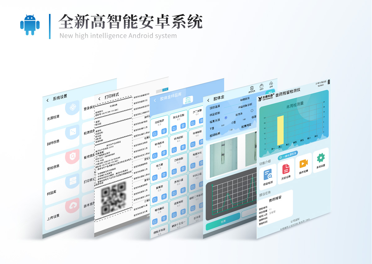 | 仪器采用10.1英寸液晶触摸屏显,搭配运行安卓智能操作系统,主控芯片采用ARM Cortex-A7,RK3288/4核处理器,主频1.88Ghz,运转速度更快速,性能更强。 | 仪器功能包括:胶体金检测模块、数字化管理模块、无线通讯模块等,可以满足同一软件下实现所有检测项目的检测,并在同一窗口展示检测结果。 | 一体化便携式快检设备,采用交直流两用供电方式,可连接车载电源,配备6ah大容量充电锂电池,可以满足现场及流动检测使用的需求。仪器尺寸:43×35×20cm, 主机净重:5.1kg | 系统自带数据集成模块,设备首页自动统计检测数据包含:周检测数据、月检测数据,全部检测总数量,均包含检测总数,合格数,不合格数,以及相关柱形分析图,对各项检测数据清晰掌握,无需电脑查询,更加快捷直观。 | 仪器具有任务预设模块,可在样品送检前提前预设样品名称、检测指标、送检单位等信息,样品送检时一键调取保存信息,检测更加方便快捷。 | 轨道式自动传输扫描方式,可实时显示金标卡实时图像,系统自动分析并呈现出CT曲线图,CT线自动识别,无需手动调整,完成检测后自动退出检测卡。 | 结果判定线可修改,对照值标定值可保存,断电不丢失数据。 | 兼容市场上其他胶体金卡,使用耗材不受限制,极大增强用户使用体验。 | 仪器检测系统拥有庞大数据库,并且构建了完善的检索、修订功能。食品库涵盖多种样品名称,可按需添加或删除、编辑样品名称;产品数据库以及历史检测记录支持一键检索功能。 | 系统打印自定义化,打印格式多样化,产品合格证(****要求),二维码,抽样信息、检测信息,受检信息、复核信息、抽样日期、检测日期等信息结果,可按需求自行设置打印内容。 | A4纸版本报告打印功能(可选配):设备拥有两种结果展示方式,可以自动生成A4打印模板和小票打印模板两种样式,可通过WiFi及网线等方式链接外置打印机可进行打印 | 仪器具有 wifi 联网上传、RJ45网线连接功能,可以快速上传数据。同步对接监管平台,数据可局域网和互联网数据上传,检测结果直接传至食品安全监管平台。进行区域食品安全监管及大数据分析处理与数据统计,检测区域食品安全长短期动态,达到食品安全问题预估、预警。 | 设备支持U盘存储,标准USB接口,免驱动安装。检测结果存储容量20万条以上,可生成Excel表格,进行一键拷贝,并具有登录保护功能,可设置用户名及密码,规范不同人员操作权限,防止非工作人员操作,并且可以进行重新校准、锁定、恢复出厂设置功能。仪器固件可升级,后期检测项目可扩充。 | 仪器具备远程升级功能,可定向分客户分仪器更新,开机后自动更新,并可持续性免费更新系统版本,无需像传统产品返厂更新,节省时间及人力成本并避免了物流运输返厂升级导致设备损坏的潜在风险。 |