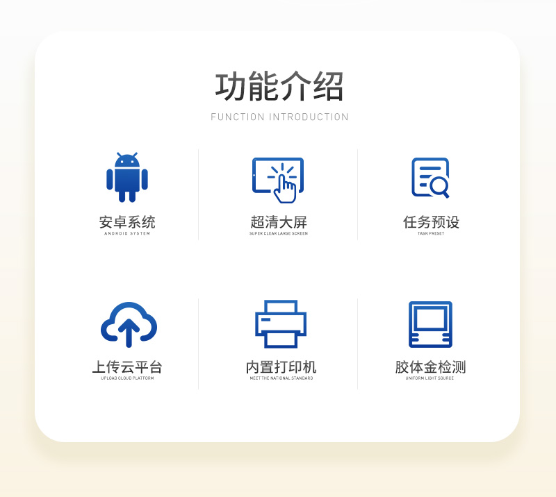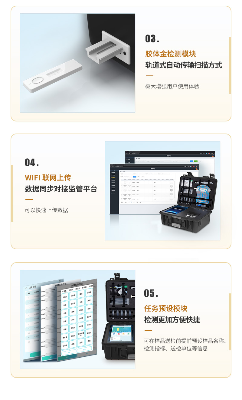 | 仪器采用10.1英寸液晶触摸屏显,搭配运行安卓智能操作系统,主控芯片采用ARM Cortex-A7,RK3288/4核处理器,主频1.88Ghz,运转速度更快速,性能更强。 | 仪器功能包括:胶体金检测模块、数字化管理模块、无线通讯模块等,可以满足同一软件下实现所有检测项目的检测,并在同一窗口展示检测结果。 | 一体化便携式快检设备,采用交直流两用供电方式,可连接车载电源,配备6ah大容量充电锂电池,可以满足现场及流动检测使用的需求。仪器尺寸:43×35×20cm, 主机净重:5.1kg | ★系统自带数据集成模块,设备首页自动统计检测数据包含:周检测数据、月检测数据,全部检测总数量,均包含检测总数,合格数,不合格数,以及相关柱形分析图,对各项检测数据清晰掌握,无需电脑查询,更加快捷直观。 | 轨道式自动传输扫描方式,可实时显示金标卡实时图像,系统自动分析并呈现出CT曲线图,CT线自动识别,无需手动调整,完成检测后自动退出检测卡。 | 结果判定线可修改,对照值标定值可保存,断电不丢失数据。 | 兼容市场上其他胶体金卡,使用耗材不受限制,极大增强用户使用体验。 | 仪器检测系统拥有庞大数据库,并且构建了完善的检索、修订功能。 | 食品库涵盖多种样品名称,可按需添加或删除、编辑样品名称; | 产品数据库以及历史检测记录支持一键检索功能。 | 系统打印自定义化,打印格式多样化,产品合格证(****要求),二维码,抽样信息、检测信息,受检信息、复核信息、抽样日期、检测日期等信息结果,可按需求自行设置打印内容。 | 内置限量规判程序:具有限量查询、添加物质合规判定系统。检测出结果后,系统自动调用系统数据库中相关国标进行比对判定,客观显示判定结果是否合格,检测对象是否允许添加该物质,若允许添加则能准确获得食品中添加该物质的限量及添加依据的****。 | 仪器具有 wifi 联网上传、RJ45网线连接功能,可以快速上传数据。同步对接监管平台,数据可局域网和互联网数据上传,检测结果直接传至食品安全监管平台。进行区域食品安全监管及大数据分析处理与数据统计,检测区域食品安全长短期动态,达到食品安全问题预估、预警。 | 设备支持U盘存储,标准USB接口,免驱动安装。检测结果存储容量20万条以上,可生成Excel表格,进行一键拷贝,并具有登录保护功能,可设置用户名及密码,规范不同人员操作权限,防止非工作人员操作,并且可以进行重新校准、锁定、恢复出厂设置功能。仪器固件可升级,后期检测项目可扩充。 | 仪器加入远程升级功能,可定向分客户分仪器更新,开机后自动更新,客户无需任何操作,即可升级全新项目。做到了无需退换机器即可实现实时远程升级检测仪器。 | 可连接外部打印机,打印A4纸规格的检测报告(可选配) |
