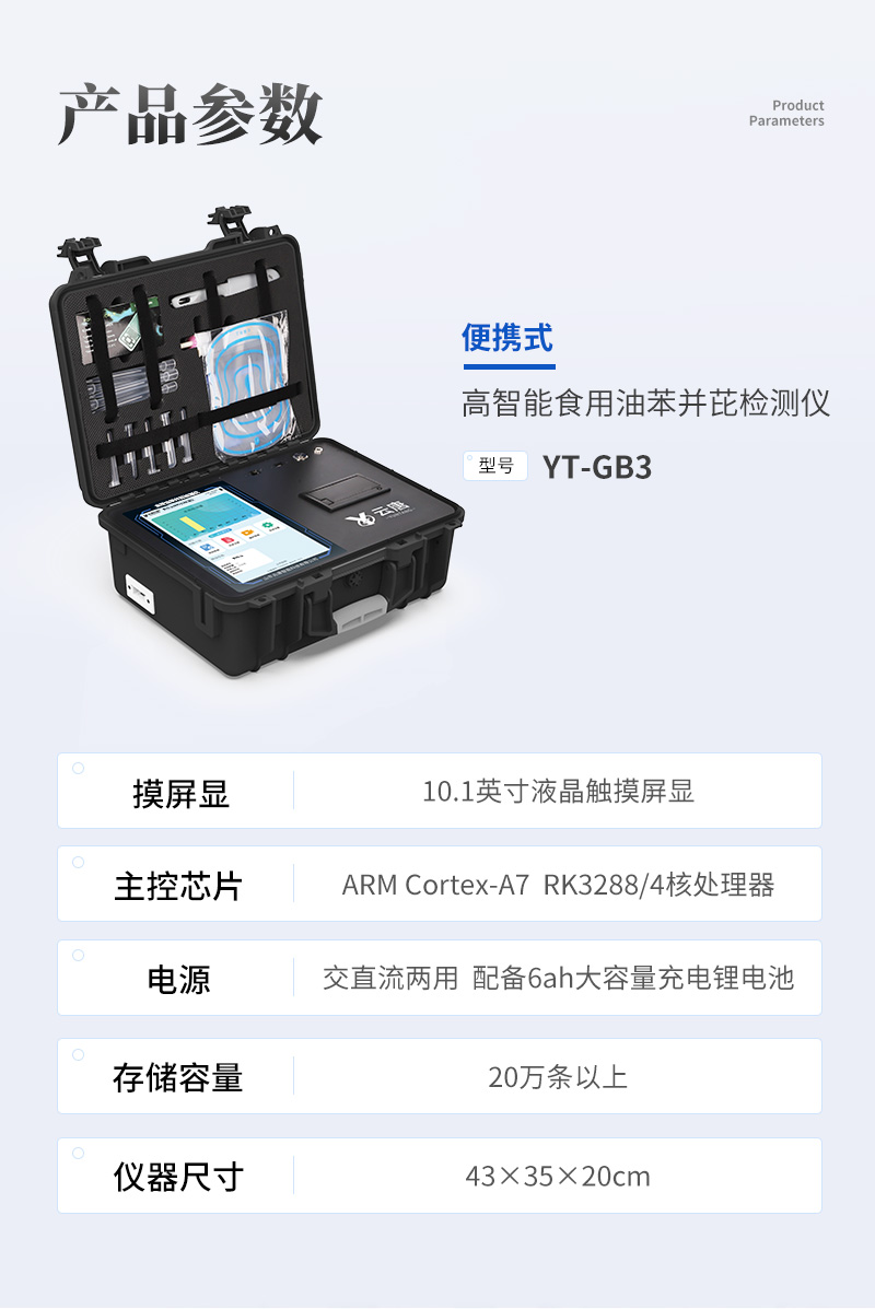 山东云唐智能科技有限公司生产的高智能苯并芘检测仪可快速检测食用油、芝麻油中的苯并芘含量是否超标,通过快速、简捷、**的处理方法,采用免疫竞争法分析原理,可以确定样品中是否含有苯并(a)芘,准确度高,为各行业的用油安全提供相应保障。
