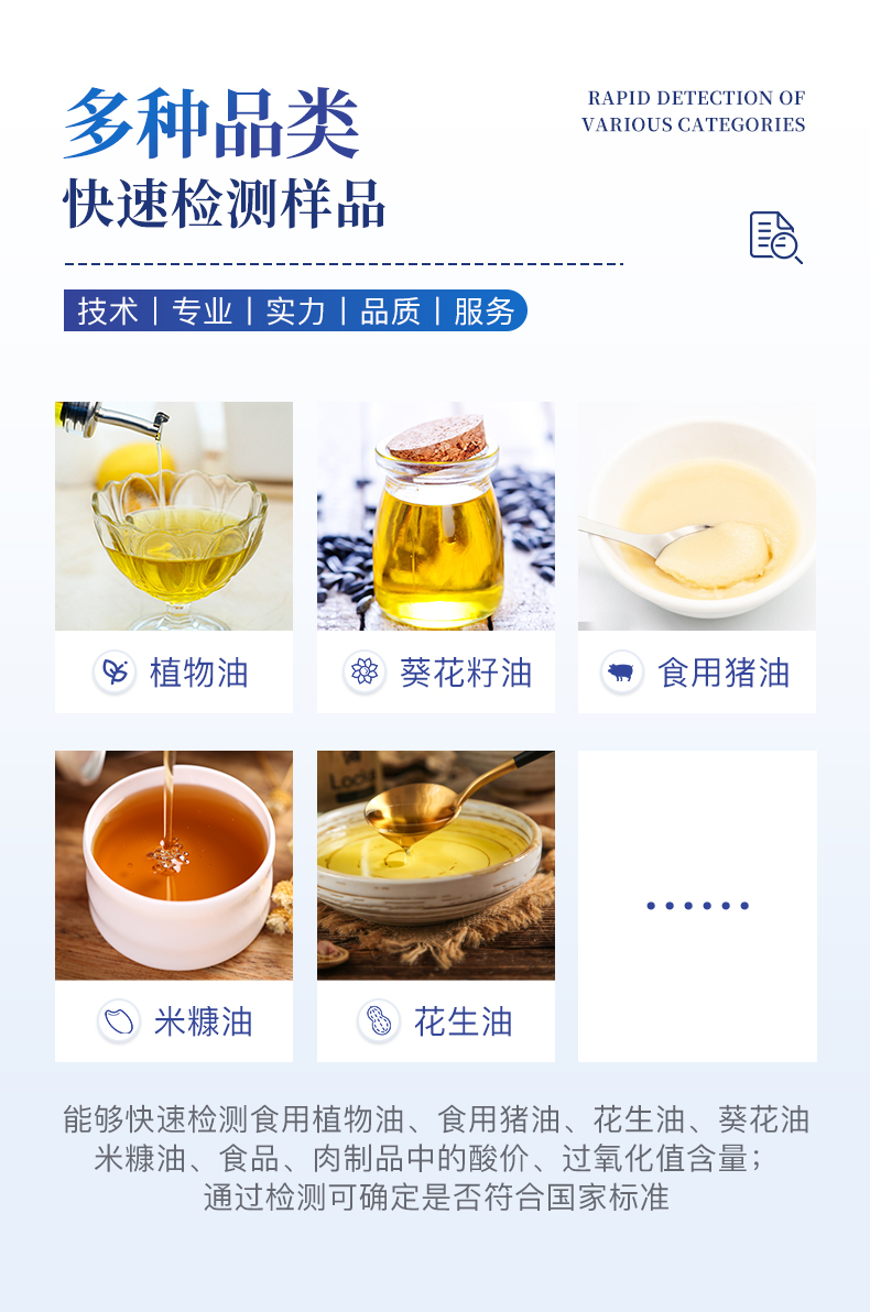 产品用途: 食用油过氧化值检测仪为集成化油品快速检测分析设备,能够快速检测食用植物油、食用猪油、花生油、葵花油、米糠油、食品、肉制品中的过氧化值含量;通过检测可确定植物油是否符合国家···     更新时间:2026-04-22