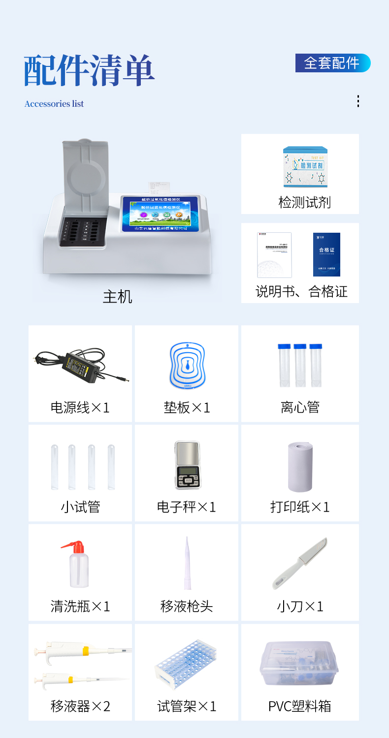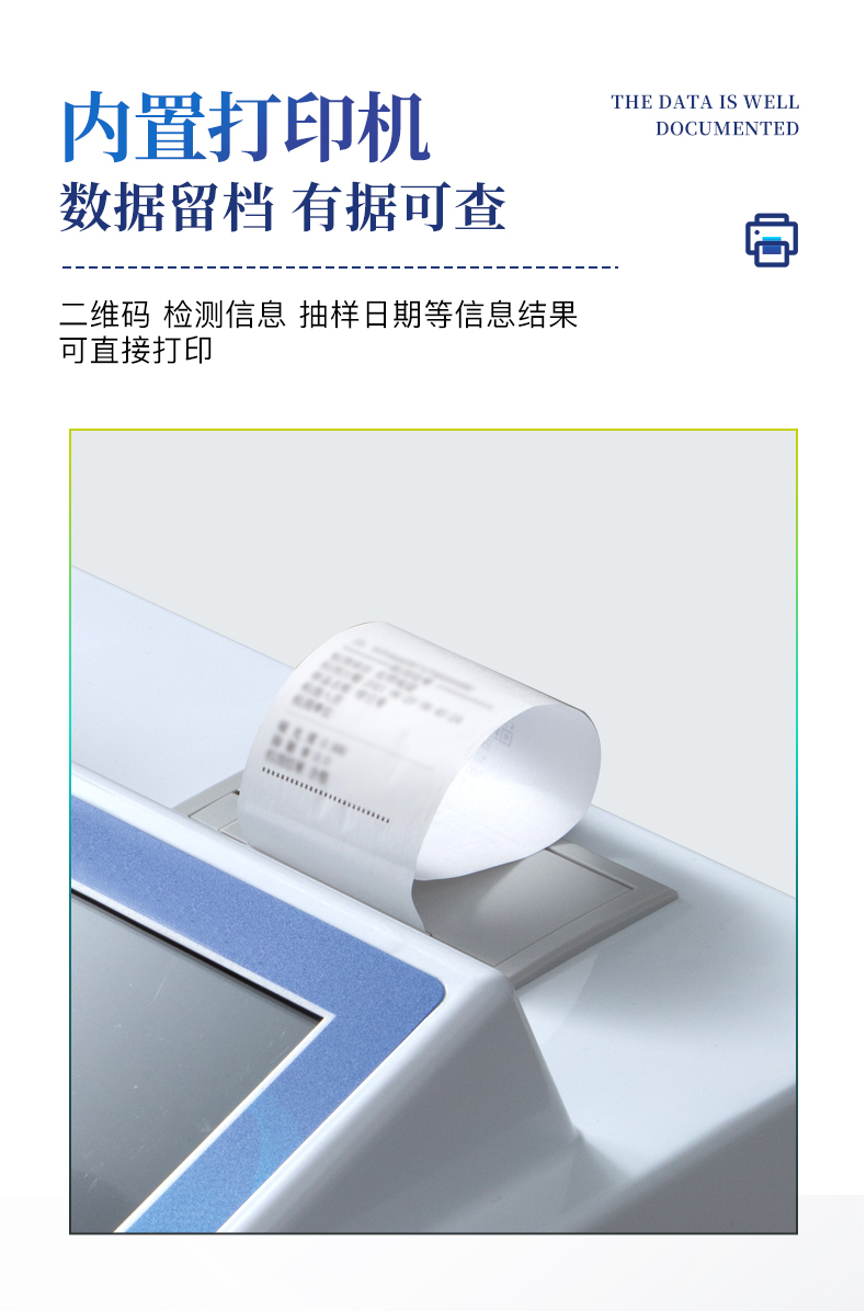 | 安卓智能操作系统,采用更加**和人性化操作,仪器具有网线连接、wifi联网上传、GPRS无线远传功能,快速上传数据。 | 一体化便携式快检设备,满足现场及流动检测使用需求,能够在同一软件下实现所有检测项目的检测,并可通过同一窗口直观显示检测结果。 | 智能化程度高,仪器具有自检功能:具有开机自检和调零功能,具有自动检测重复性功能。 | 检测通道:≥12个检测通道,可以同时测试多个样品,每个样品由程序控制分别独立工作,不会互相干扰。 | 显示方式:≥8英寸液晶触摸屏显示,人性化中文操作界面,读数直观、简单。 | 配备新一代嵌入式热敏打印机,可选择手动打印或者自动打印,检测完成可自动打印检测报告和二维码。 | 光源采用进口超高亮发光二极管,高精度、稳定性强、光源可控、可以关掉不使用的光源,功耗更低。 | 采用USB2.0接口设计,方便数据的存贮和移动,并可随时与计算机直接相连,并且可用计算机控制仪器。实现数据查询、浏览、分析、统计、打印等。 | 仪器具有品类多种类样品菜单库,可灵活选择检测样品,不同的检测通道可同时检测不同的样品项目。 | 样品处理简单省力,整体操作快速、安全、便捷。 | 仪器具有自身保护功能,可设置用户名及密码,防止非工作人员操作等。 | 高灵敏度,高检测精度,高重复性精度,扫描式高精度光学传感器。 | 过氧化值检测仪器具有重新校准、锁定、恢复出厂设置功能。 | 结果判定线可修改,对照值标定值可保存,断电不丢失数据。 |