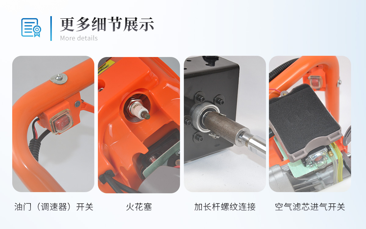 | 汽油机(动力增至52CC,马力更强劲!) 一台 | 砖头(插销连接、开口设计) 一个 | 延长杆(长:50CM,插销连接) 4根 | 刮刀 一把 | 钢卷尺(3米) 一个 | 手套 一双 | 合格证 一份 | 说明书 一份 | 杠杆(辅助提取设备) 一只 | 便携包 一支 | 铝箱 一个 |